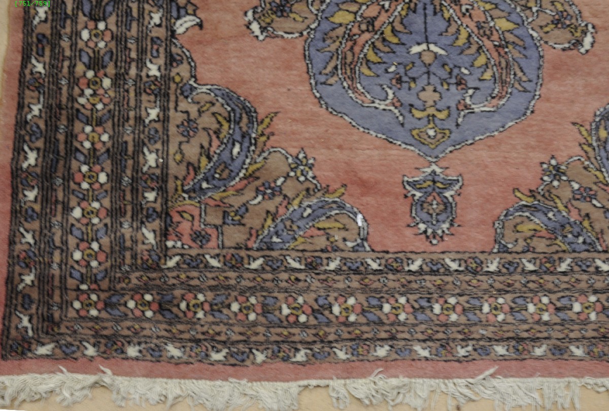 TAPIS d'Orient en laine à points noués, à décor persan, médaillon central sur fond rose. Long. 192 Larg. 130 cm.