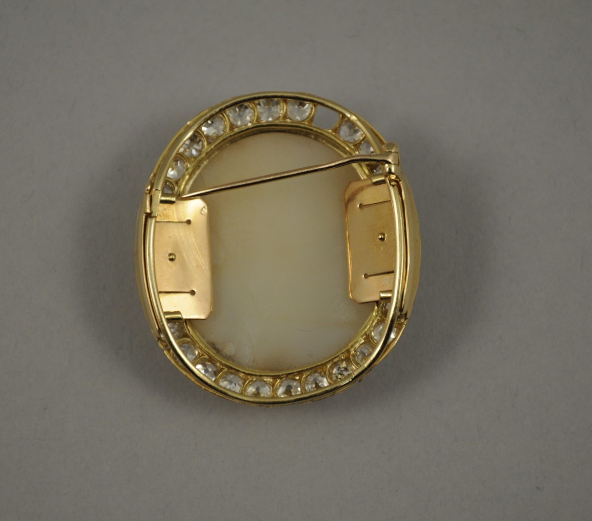 Fermoir transformé en BROCHE, de forme ovale en or jaune, ornée au centre d'un camée onyx représentant un dieu grec dans un entourage de diamants de taille ancienne d'environ 5,50 carats (manque un diamant et une partie du fermoir, petits manques au dos du camée), la monture en or jaune.