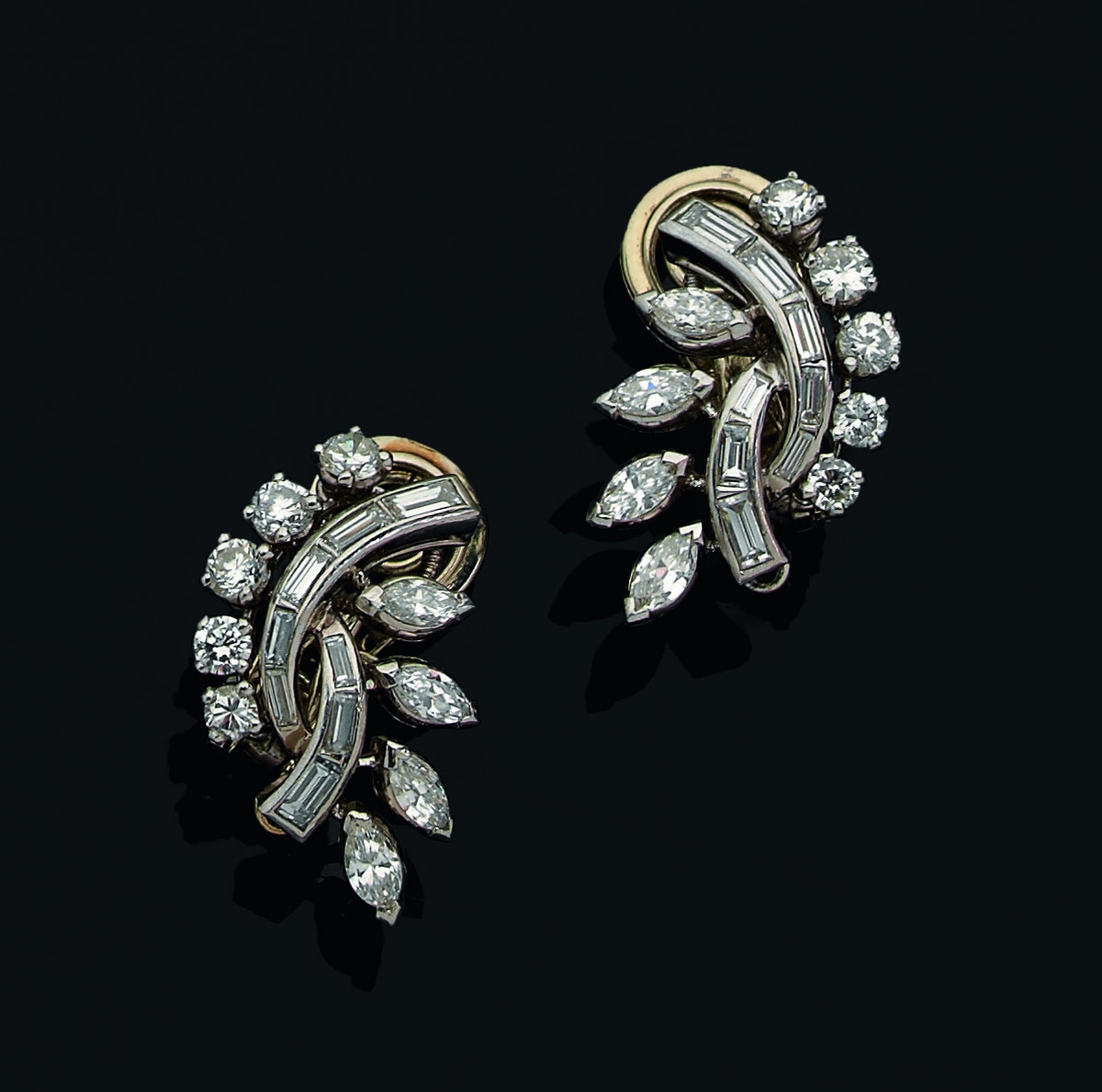 Paire de BOUCLES d'OREILLES, système à pince, en platine et or gris, de forme volute, serties de deux lignes de diamants baguettes entre une ligne de diamants ronds de taille brillant et une ligne de diamants navettes.