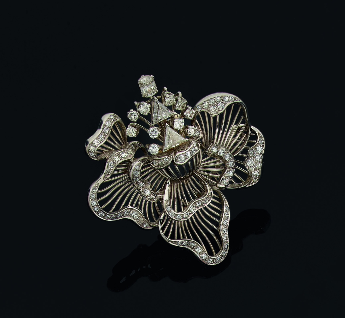 BROCHE pouvant former pendentif, de forme mouvementée, stylisant une fleur en platine ajourée, partiellement sertie de diamants ronds et de deux diamants de forme triangulaire au centre.