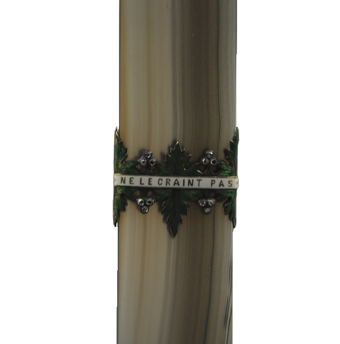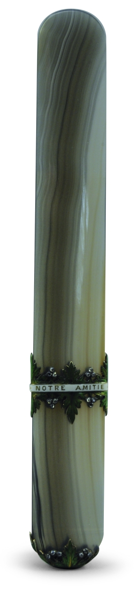 COUPE-PAPIER en agate. Ornementation émaillée, avec l'inscription "Notre amitié ne le craint pas" en lettres dorées sur fond blanc, entourée de feuilles vertes et de motifs tréflés avec brillants.