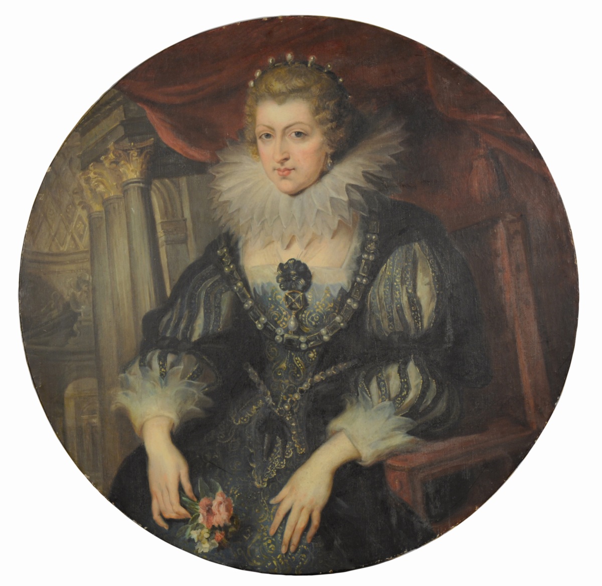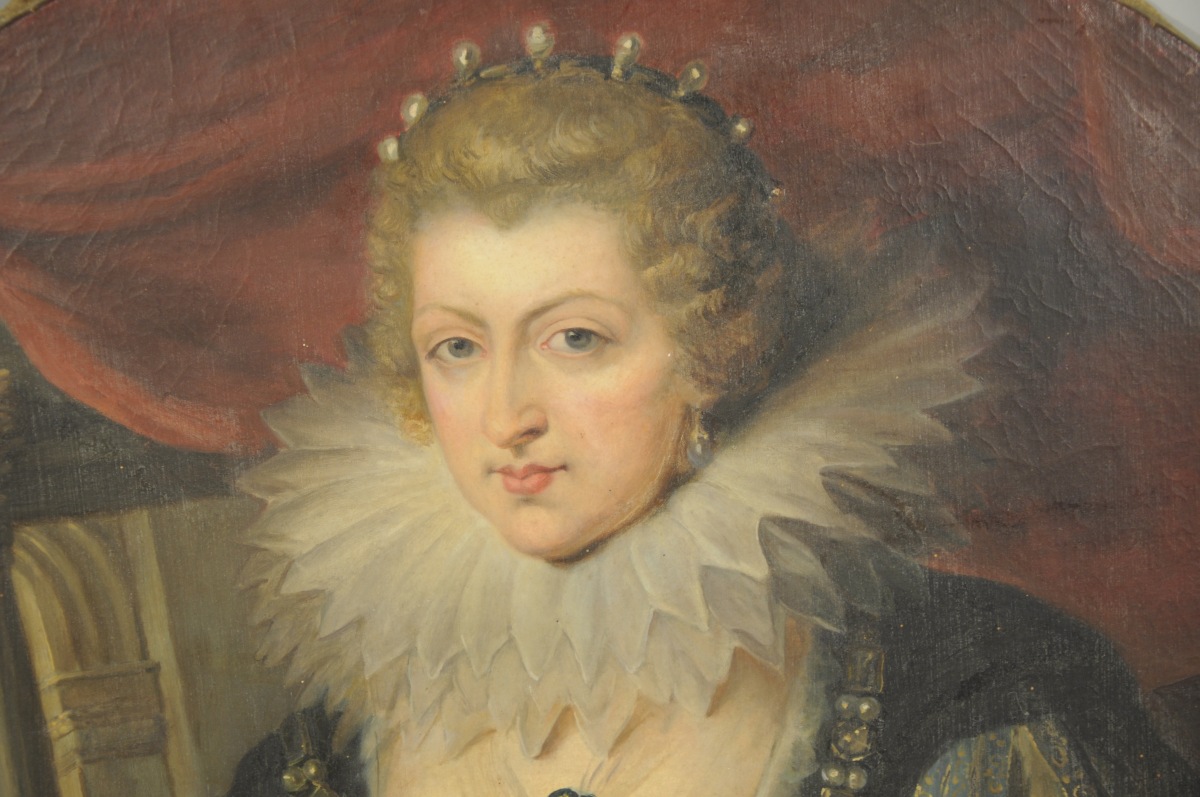 Peter Paul Rubens (1577-1640) profite de son séjour à la Cour de France à l'hiver 1622 pour réaliser des portraits de la famille royale. Certains sont exposés au Prado à Madrid où ils avaient été envoyés par la Reine Anne d'Autriche (1601-1666) à sa famille et d'autres à la Norton Simon Fondation de Los Angles. Le Rijsk Museum d'Amsterdam conserve également un portrait de la Reine, daté de 1625, alors que la France a étrangement perdu ses toiles originales. Le tableau conservé au Louvre (Haut. 105, Larg. 93 cm) porte en effet le numéro 456 de l'inventaire des collections royales par Le Brun. Il n'est donc entré qu'après 1683 dans la possession de Louis XIV, qui l'expose dans sa chambre. Ce portrait de la mère du roi est aujourd'hui présenté comme " d'après Rubens ". On sait en effet que Rubens a gardé certaines toiles originales jusqu'à sa mort dans son atelier.