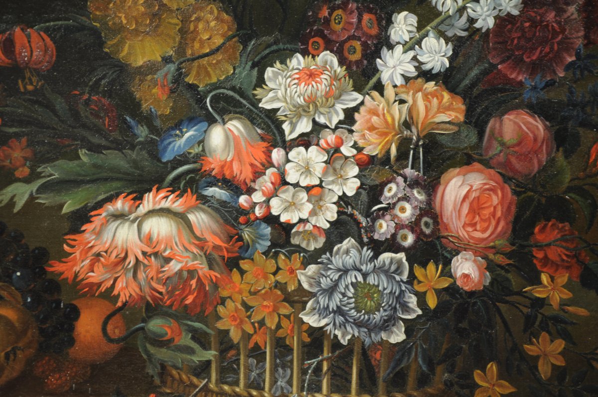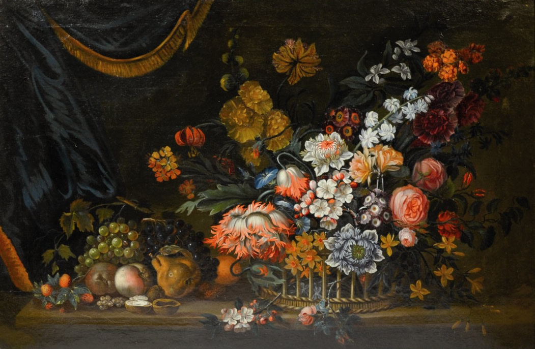 Corbeille de fleurs et fruits.