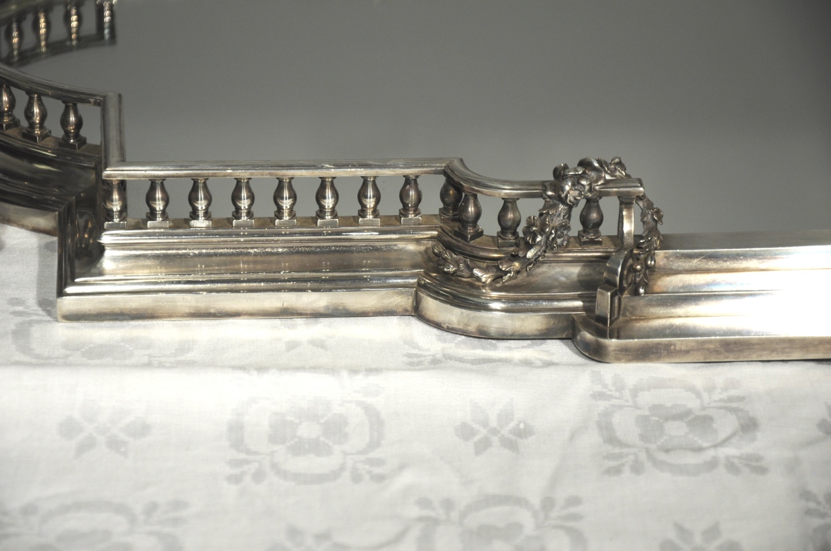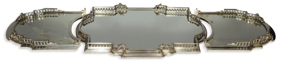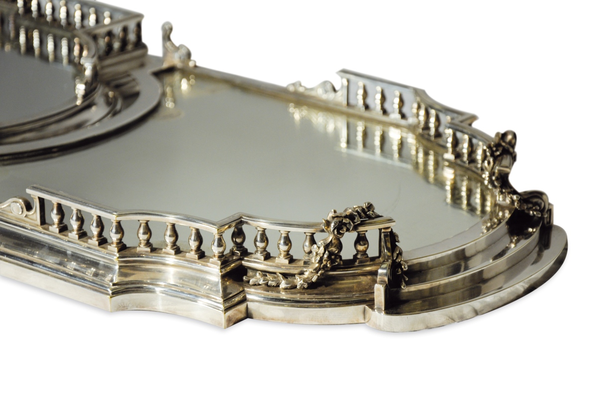 SURTOUT de TABLE en métal argenté comprenant trois éléments foncés de miroirs. L'élément central de forme rectangulaire, aux extrémités de forme arrondie. Il simule une terrasse avec balustrade, escaliers et guirlandes de fleurs.