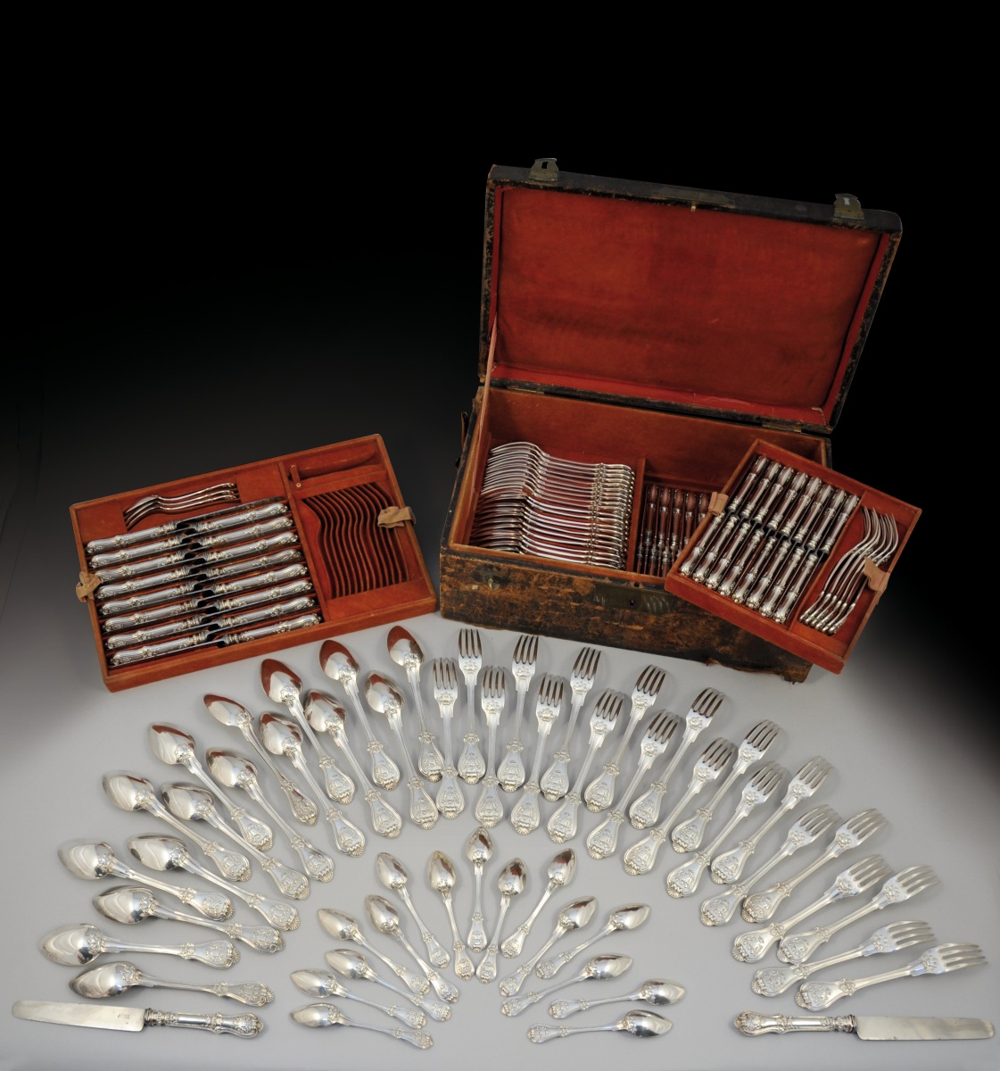 MÉNAGÈRE en argent, comprenant 132 pièces : 16 couverts de table, 6 fourchettes de table, 16 couteaux de table (lames acier oxydées, marquées Aucoc Bvté du Roi), 16 couverts à dessert, 16 couteaux à fromage (lames acier, marquées A Aucoc Paris, dont une oxydée),16 couteaux à fruits (lames argent), 16 cuillères à café.