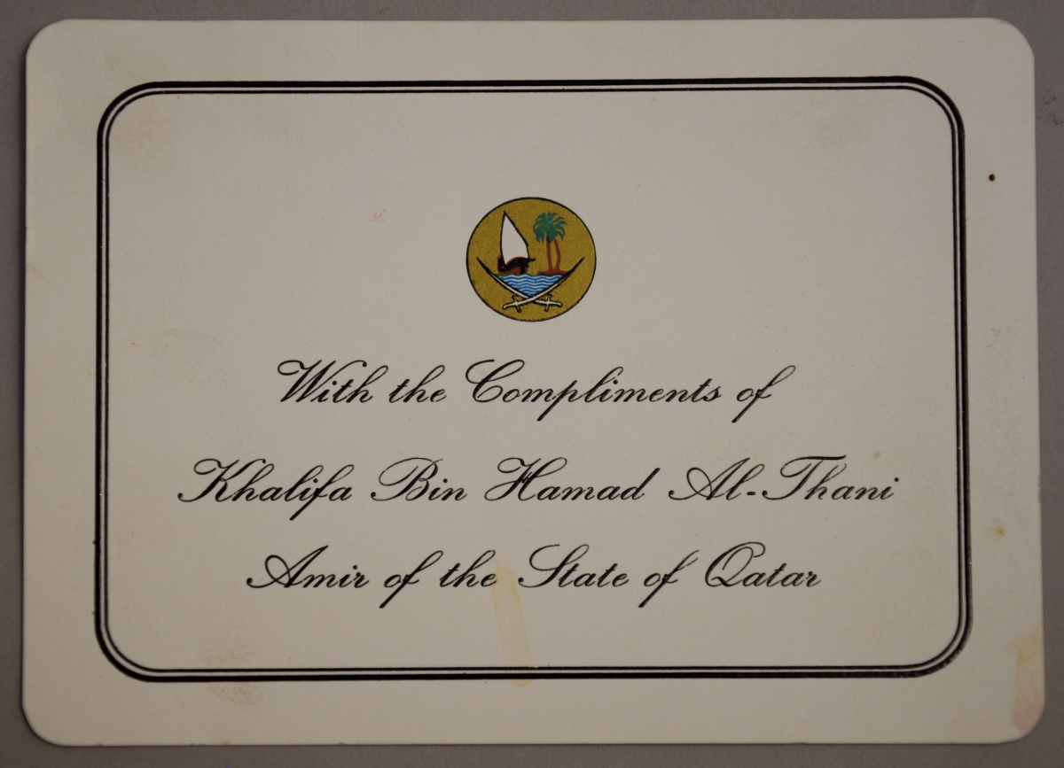 Écrin de présentation en cuir avec impression : "State of Qatar" et drapeau Qatari.
