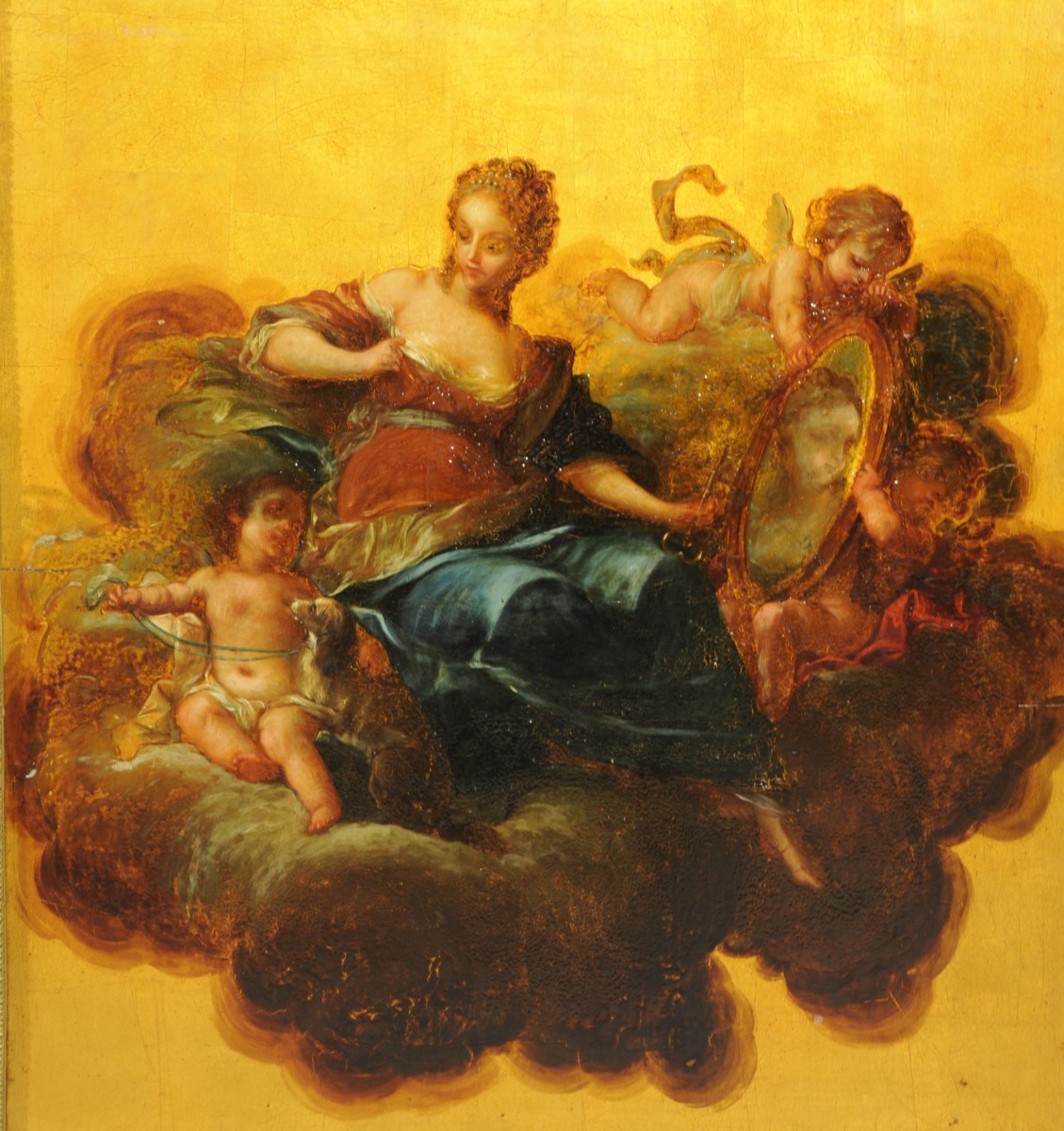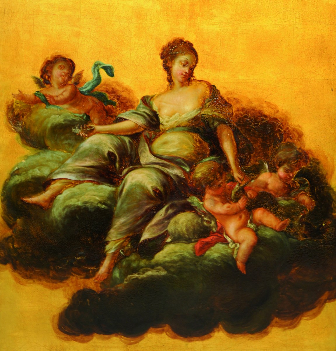 Sur l'un, la scène représente une allégorie de la Fécondité : "Elle tient près de fon fein vn nid de Chardonnerets ; & à fes pieds fe voyent d'un côté des petits lapins qui se ioüent; comme auffi des poussins