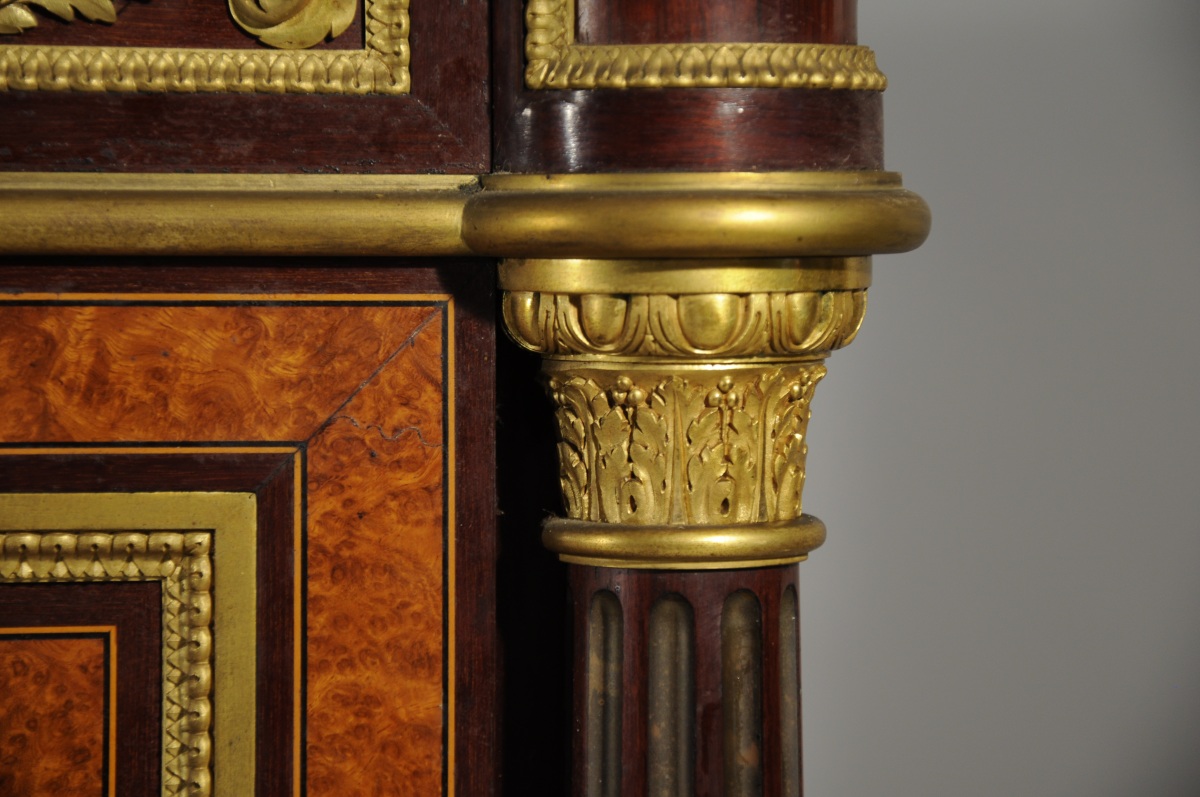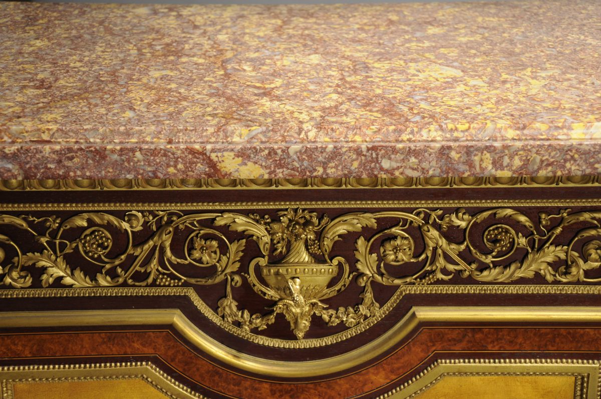 PAIRE de BUFFETS à HAUTEUR D'APPUI en placage de loupe d'amboine et acajou, à façade et côtés à ressaut. Ils ouvrent à un large tiroir en ceinture surmontant un vantail échancré orné d'une scène allégorique en vernis Martin. Montants en colonnes cannelées détachées. Pieds toupies. Dessus en placage de marbre brocatelle d'Espagne. Très riche ornementation de bronzes ciselés ajourés et dorés ornés de rinceaux, feuillages et cistres, inspirée des modèles de Riesener.