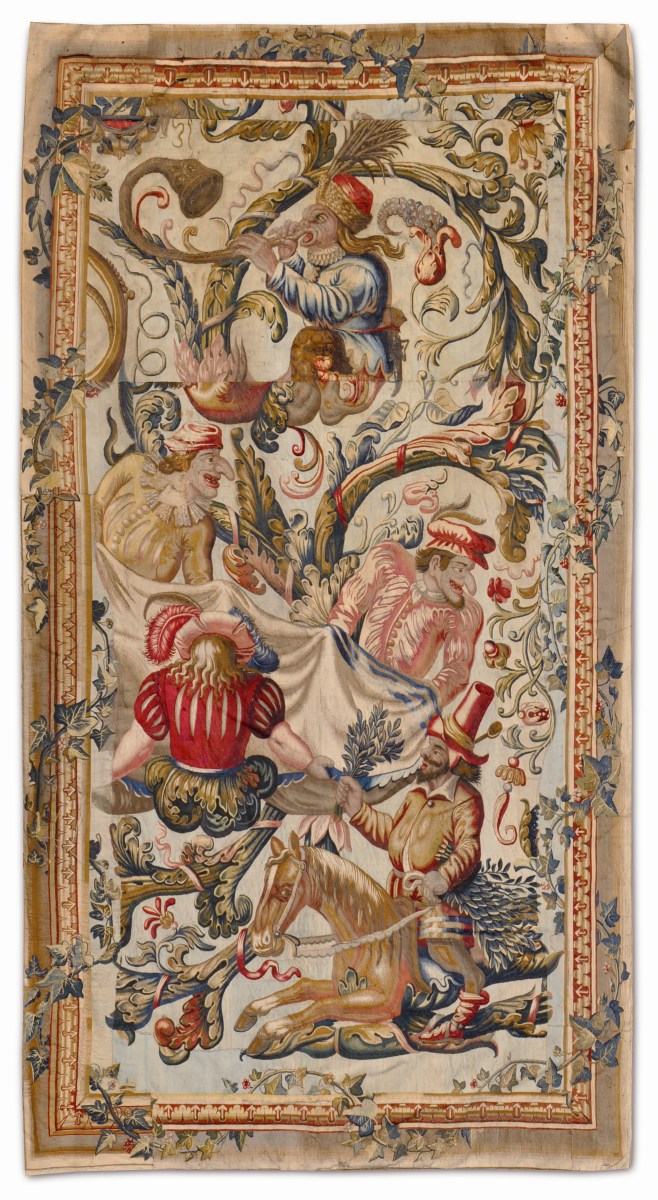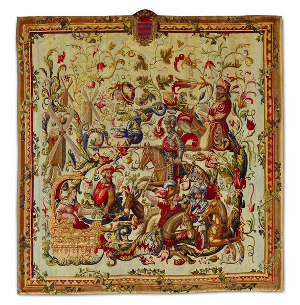 Une première tenture, comprenant six pièces d'après le roman de Cervantès, est tissée, en 1670, dans les ateliers de Mortlake, en Angleterre, par James Bridges, originaire de Bruges, et son successeur, Francis Poyntz, originaire d'Arras. D'inspiration grotesque, "avec des volutes et figures fantastiques, un mouvement joyeux et turbulent, à l'image des mascarades qui avaient lieu à la Cour", elle est exécutée pour le roi Jacques II d'Angleterre, pour l'Antichambre du Palais de Whitehall.