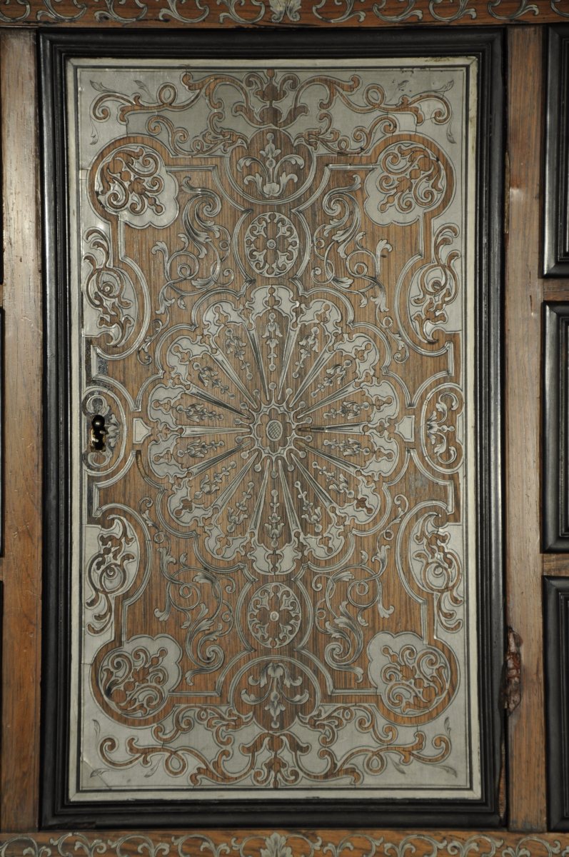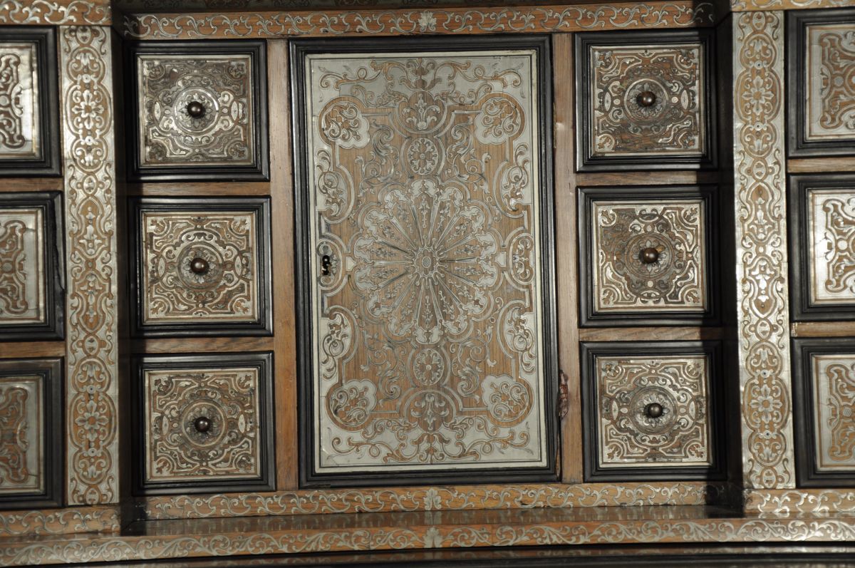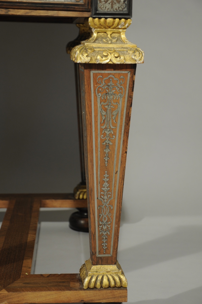 Riche décor de rinceaux et de cartouches feuillagés en incrustations d'étain. Bases et chapiteaux des pieds gaines en bois sculpté de feuillages et doré.