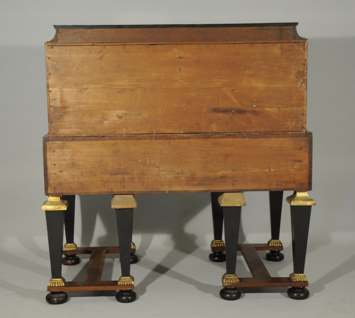 BUREAU à GRADIN d'après un modèle de BOULLE, en placage de palissandre et incrustations d'étain. Il comporte un gradin en partie supérieure, ouvrant par une porte centrale, six petits tiroirs et six autres plus grands aux extrémités. Corniche en doucine, comprenant un casier à secret. Le plateau supérieur coulissant découvre une écritoire garnie de velours rose et comportant trois tiroirs dans le fond. Trois tiroirs en ceinture. Repose sur huit pieds gaines, réunis par deux entretoises.