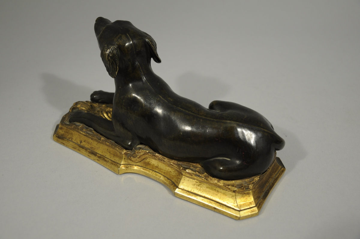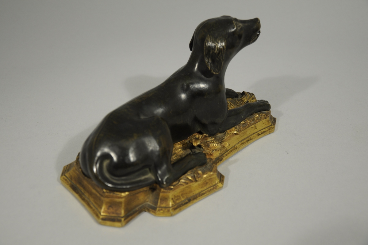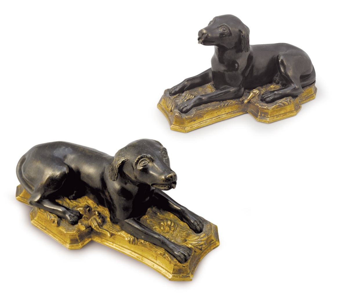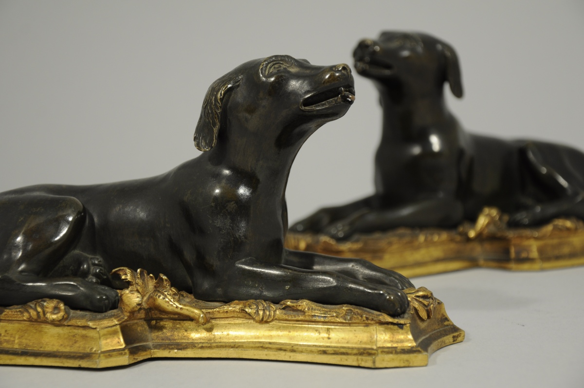 Accessoires de l'homme de lettres, ces chiens sont à poser à même les dossiers, sur le maroquin en cuir d'une table de travail : fidèles gardiens des secrets qu'ils protègent. Des objets de cette qualité sont peu nombreux. Une paire de plaques à papier en porcelaine de Vincennes est conservée au musée des Arts décoratifs de Paris. Une autre était inventoriée par Edme François Gersaint, en 1747, dans le catalogue de la succesion de Monsieur Angran Vicomte de Fonspertuis, sous le numéro 374 : "Il y a de plus une Plaque à papier, formée par un Rocher de Porcelaine, monté en Bronze. Le tout est posé fur une grande Terrasse de Bronze parfaitement reparé & doré."