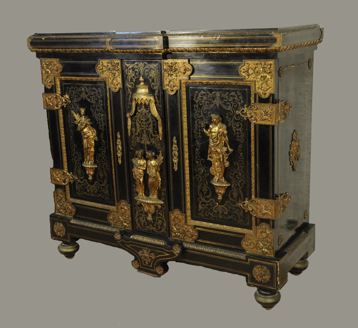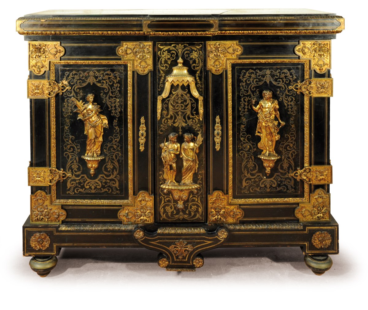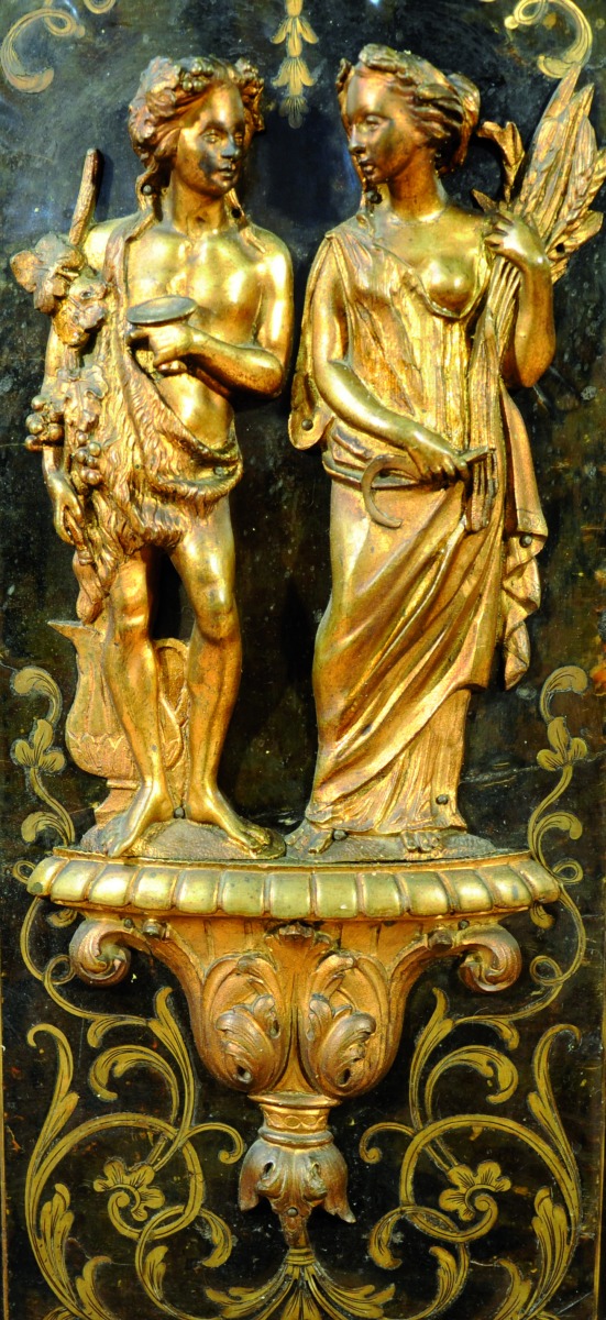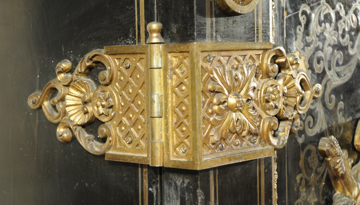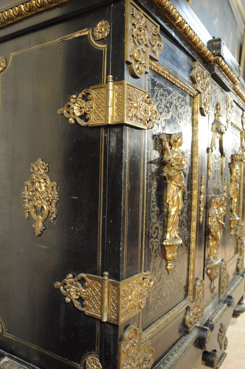 En placage d'ébène, il ouvre par deux vantaux marquetés en première partie de laiton sur fond d'écaille. Très riche ornementation de bronzes ciselés et dorés, dont allégories des Saisons : Cérès pour l'été, Bacchus pour l'automne, sur les portes et le dormant. Autres bronzes répartis en des points stratégiques sur le placage d'ébène : corniche à oves, masques de vieillard, angles à rosettes, baldaquin en dais, cul-de-lampe, charnières et pentures. Dessus de marbre noir encastré.