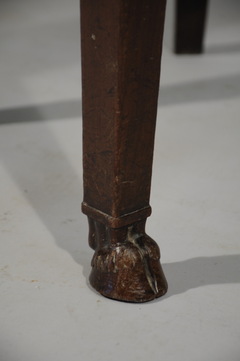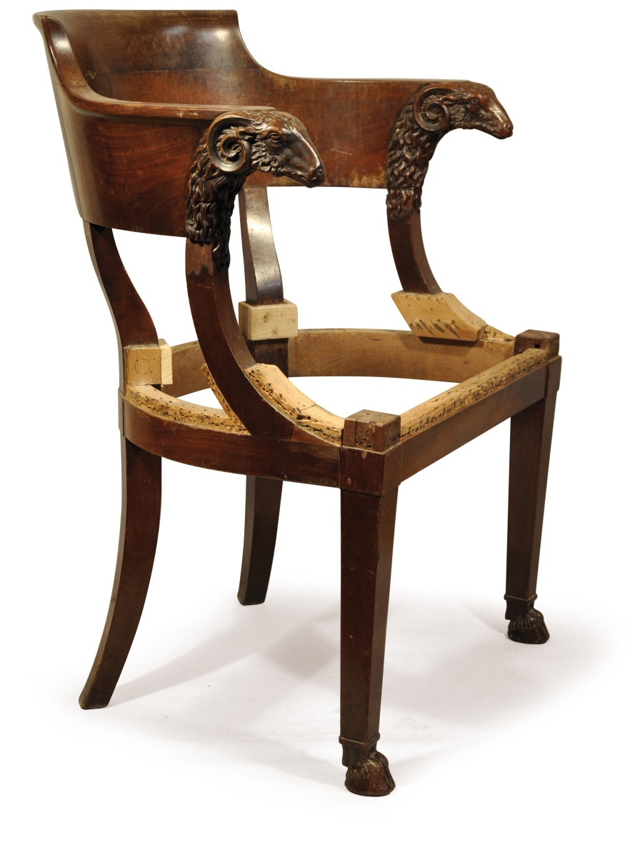 Fût de FAUTEUIL de BUREAU en acajou et placage d'acajou. Dossier à bandeau, avec accotoirs se terminant en têtes de béliers. Pieds antérieurs carrés et fuselés, reposant sur des sabots de capridés. Pieds postérieurs sabres.