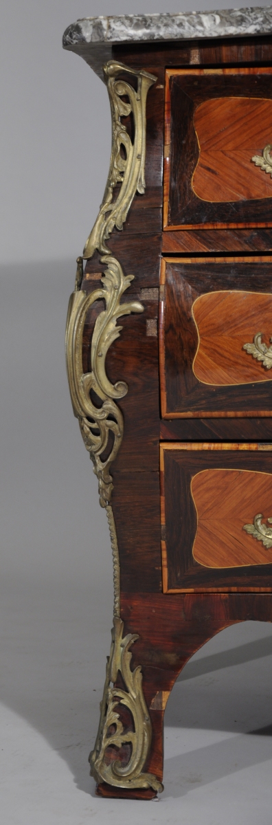COMMODE TOMBEAU galbée sur trois côtés, à ceinture chantournée et pieds légèrement cambrés. Elle ouvre par cinq tiroirs sur trois rangs. Placage en frise de bois de rose, dans des réserves soulignées de filets de bois clair, sur fond de bois de violette. Riches garnitures de bronze doré, telles que poignées fixes, entrées de serrure, cul-de-lampe, chutes d'angles et sabots de pieds, à décor rocaille de coquilles et de fleurs.