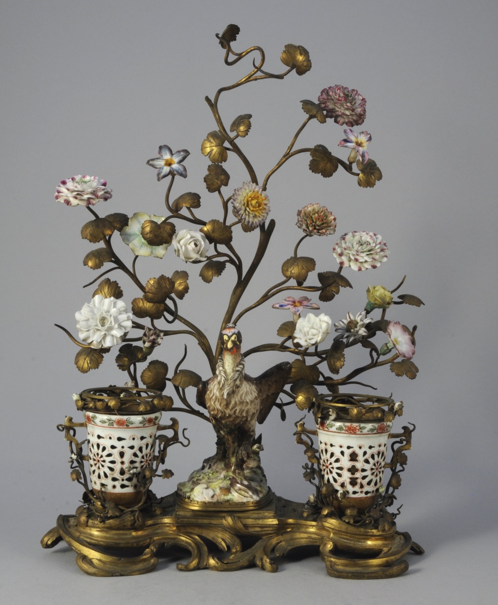 Monté en bouquetière, avec une paire de vases en céramique polychrome ajourée.