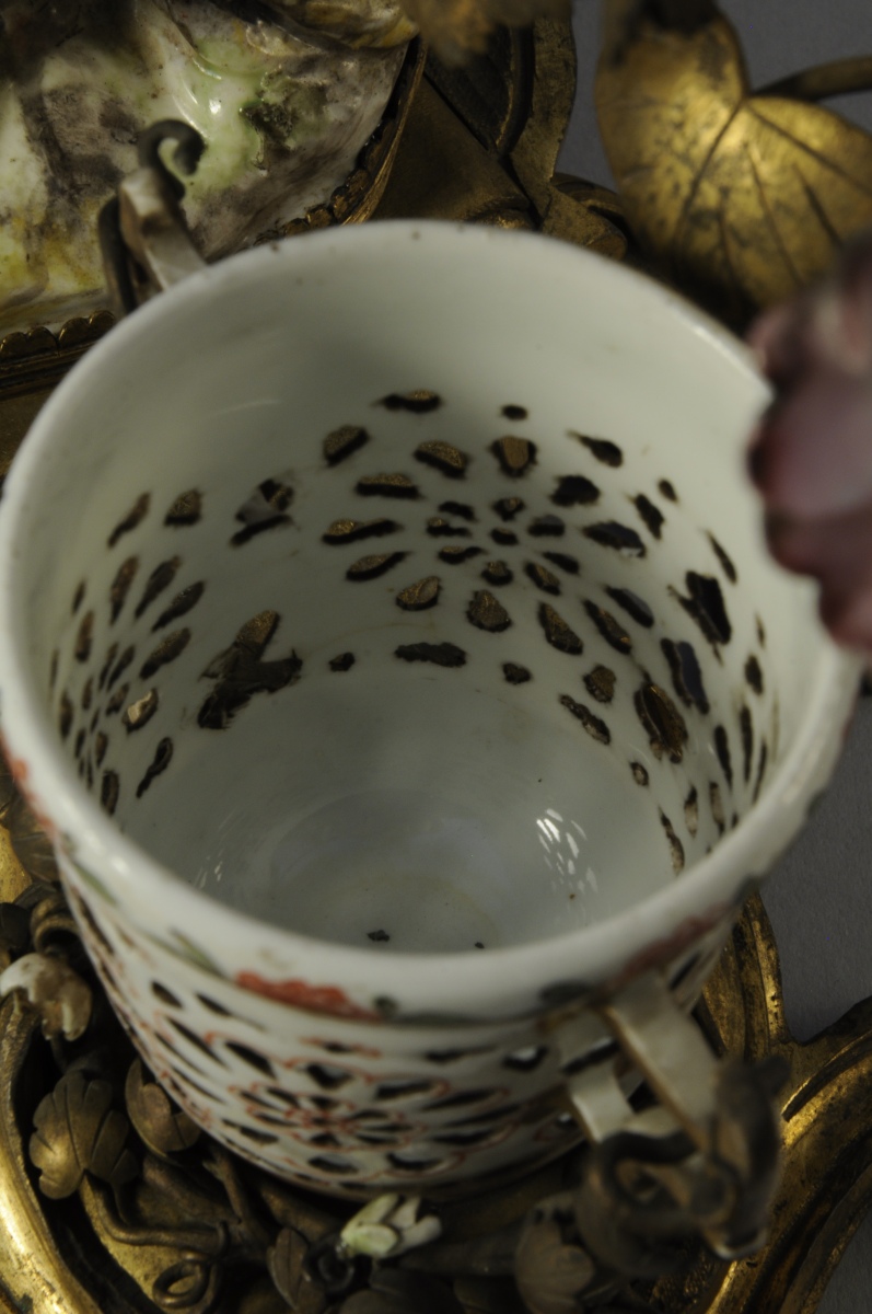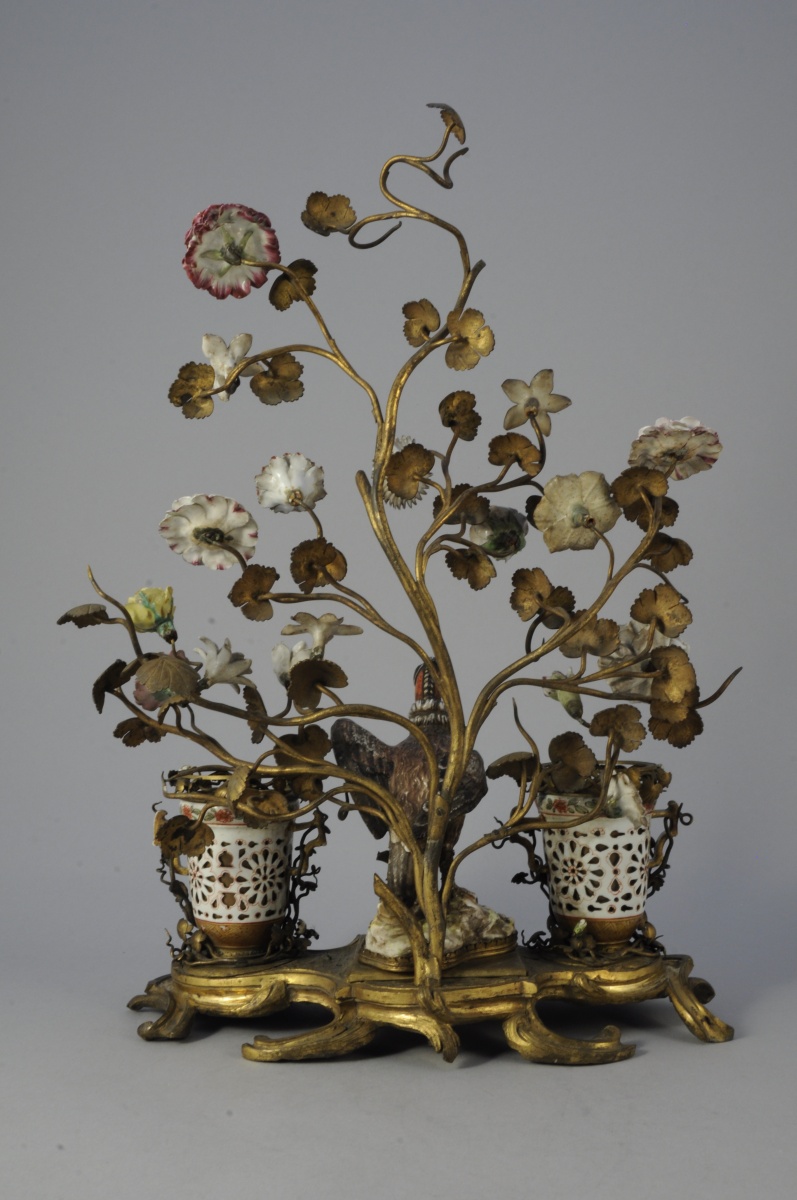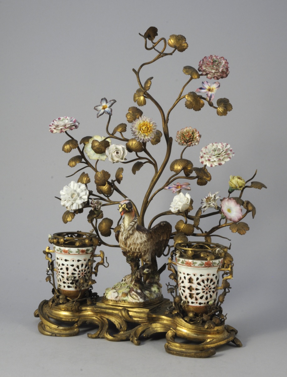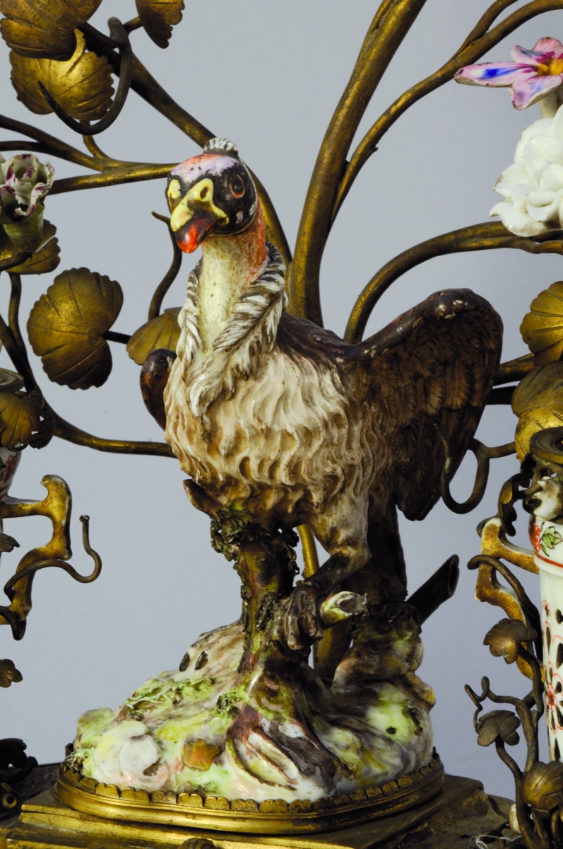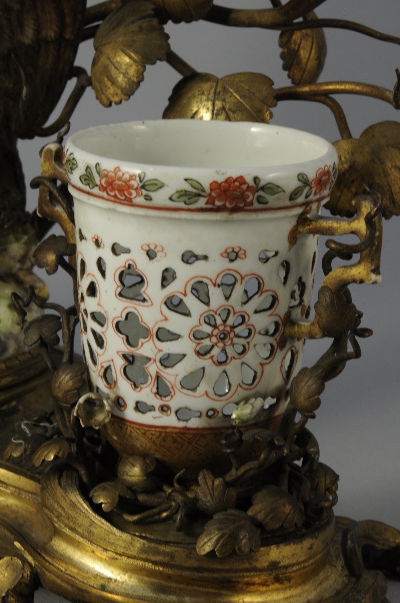 ENCRIER ? PORTE-LUMIÈRE ? en bronze doré et ciselé. Plateau mouvementé et décoré de feuillages stylisés, au milieu desquels se dresse un vautour en porcelaine peint au naturel, devant des branchages fleuris.