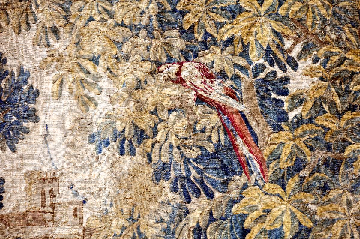 Verdure avec fond de paysage orné d'un pont, de clochers et de remparts. Elle est animée d'un perroquet branché et, au premier plan à gauche, d'un cygne pourchassé par un chien. Bordure à fleurons ocres et bruns.