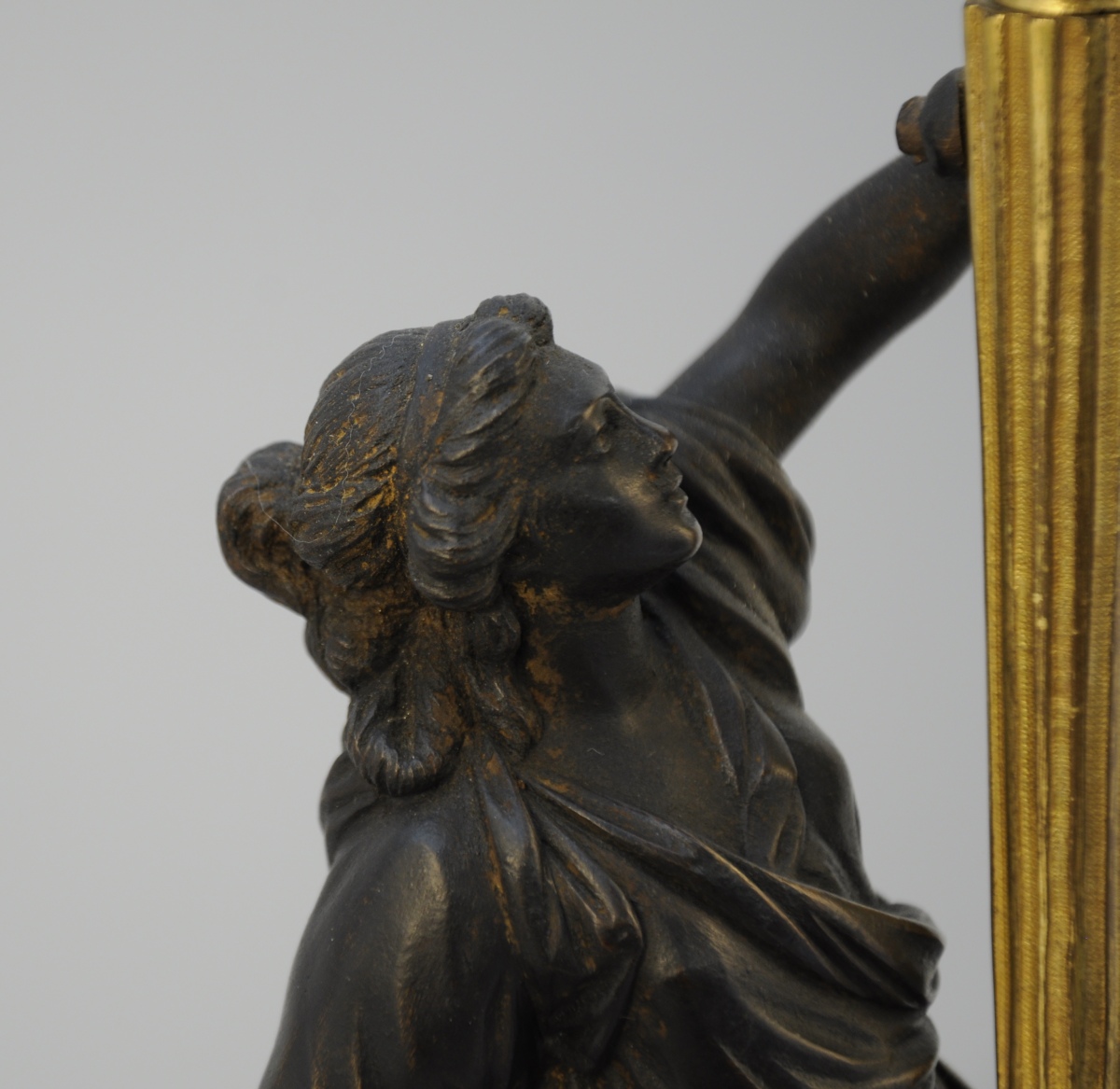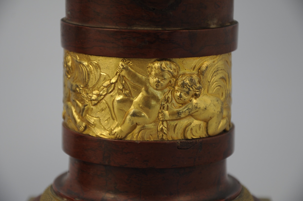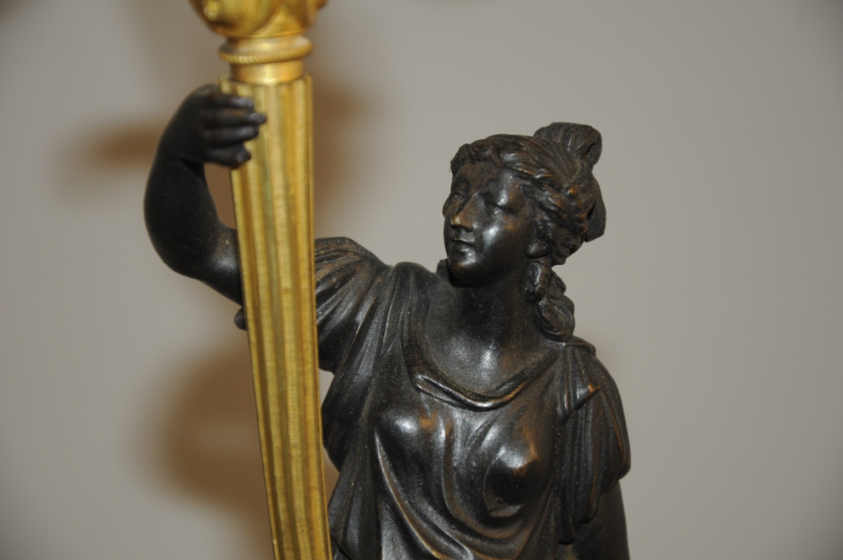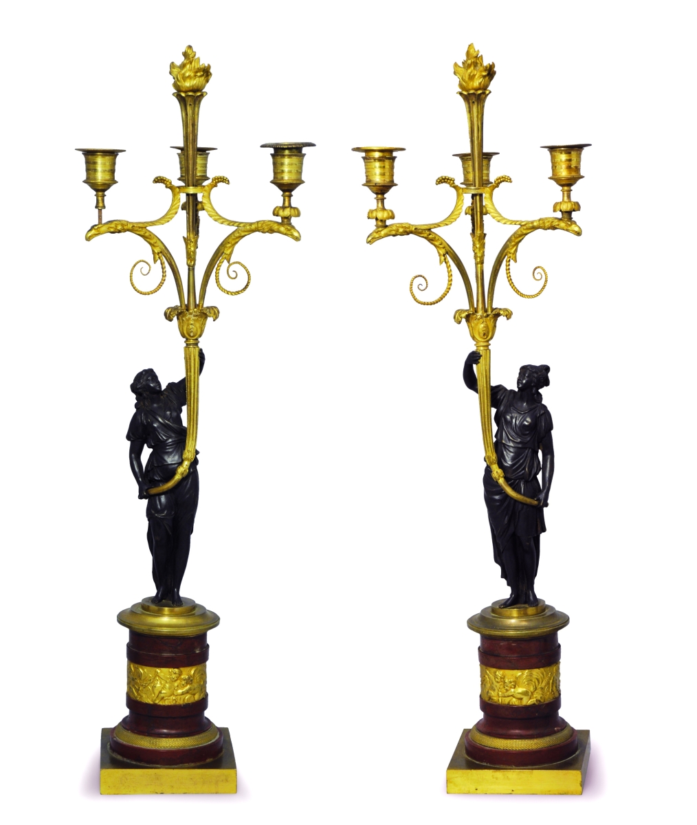 PAIRE de CANDÉLABRES à trois bras de lumières en bronze ciselé, patiné et doré. Les fûts composés d'une figure de femme drapée à l'antique, soutenant une corne d'abondance. Bras de lumières feuillagés et terminés par des têtes d'aigle. Tige centrale en forme de flambeau. Ils reposent sur un socle circulaire en marbre rouge griotte, orné d'une frise en bronze doré figurant des putti jouant. Base carrée.
