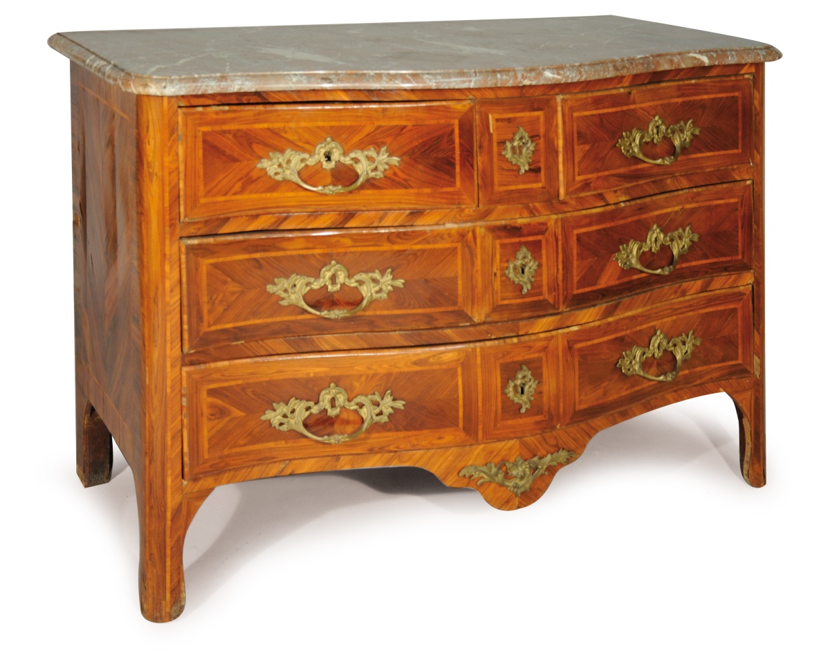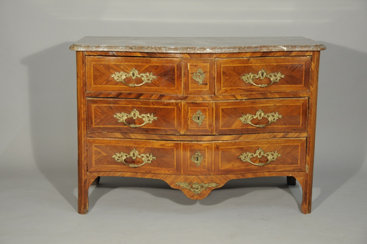 COMMODE à façade galbée, en placage de bois de violette en frise et filets de bois de rose. Elle ouvre par cinq tiroirs sur trois rangs. Montants arrondis et pieds droits. Tablier à cul-de-lampe. Garnitures de bronzes ciselés et dorés, telles que poignées fixes et entrées de serrures ornées de coquilles et feuillages rocailles.