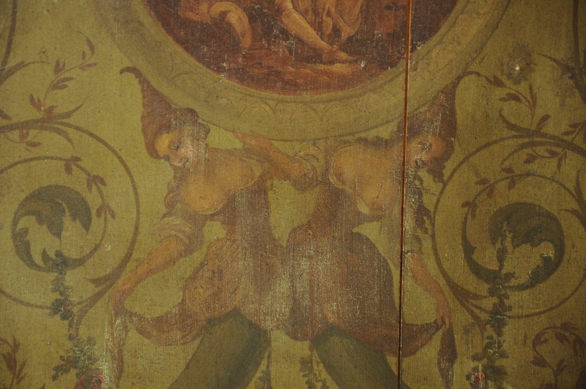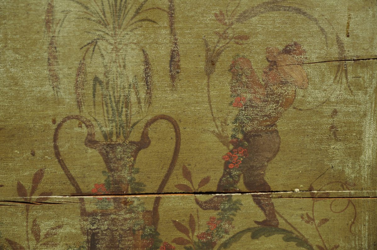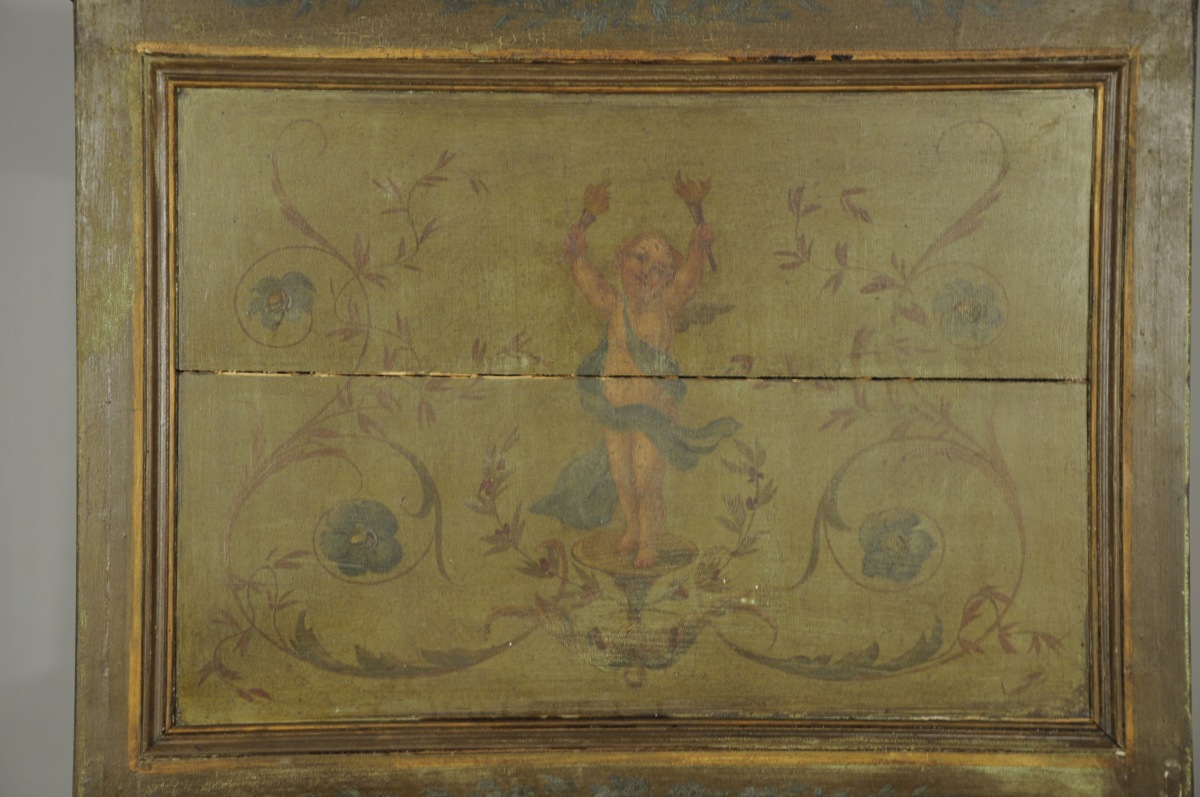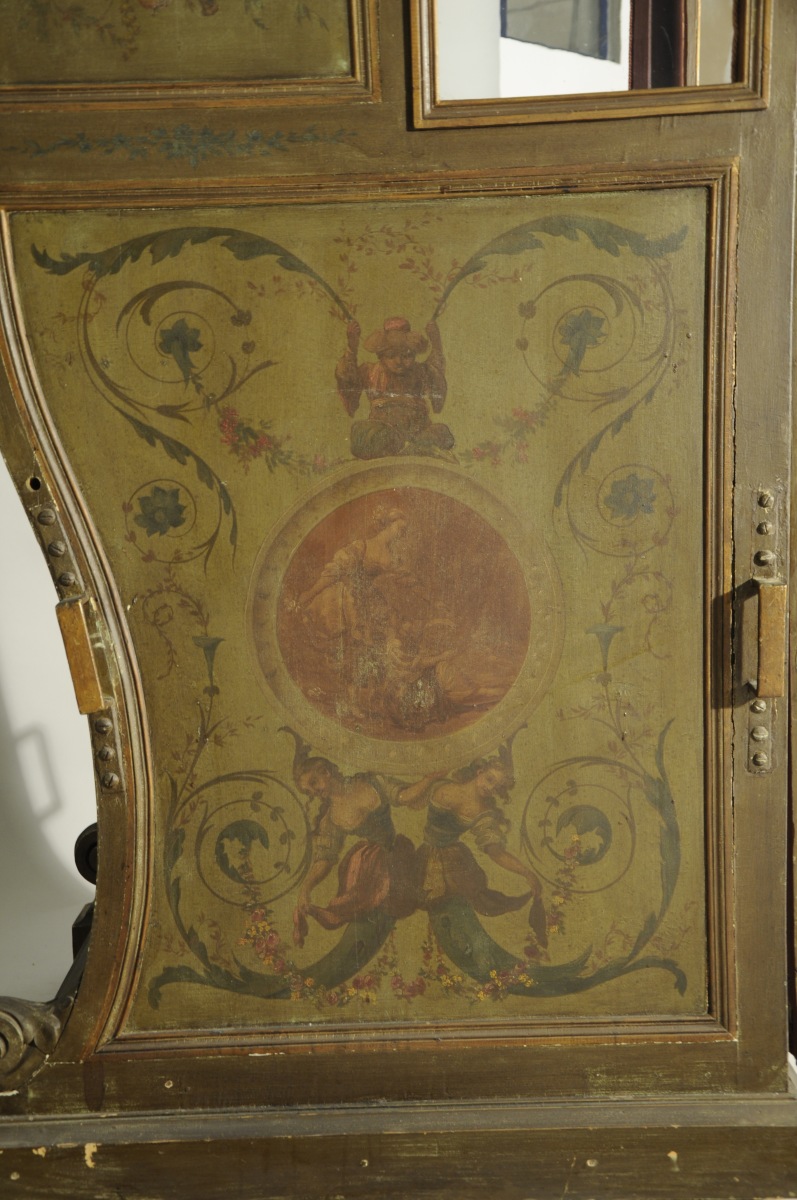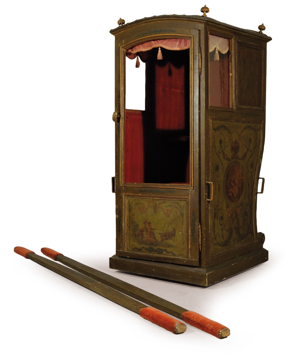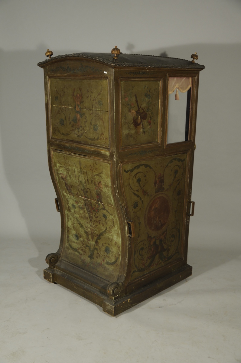 CHAISE à PORTEURS en bois peint. Sur les côtés, décor de trophées de musique et de figures grotesques tenant des rinceaux de feuilles et de fleurs, entourant des scènes galantes en camaïeu orangé, dans des médaillons. Sur la porte sont figurés, en partie inférieure, des enfants attelant un bouc, sur un fond de paysage. À l'arrière, un Amour brandit deux flambeaux, tandis que deux petits personnages turcs soutiennent des guirlandes de fleurs de part et d'autre d'un vase.