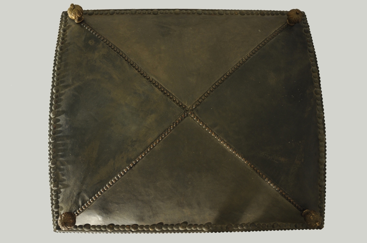 Toit bombé garni de cuir, à petits clous ronds. Montants arrières sculptés de volutes en partie basse.