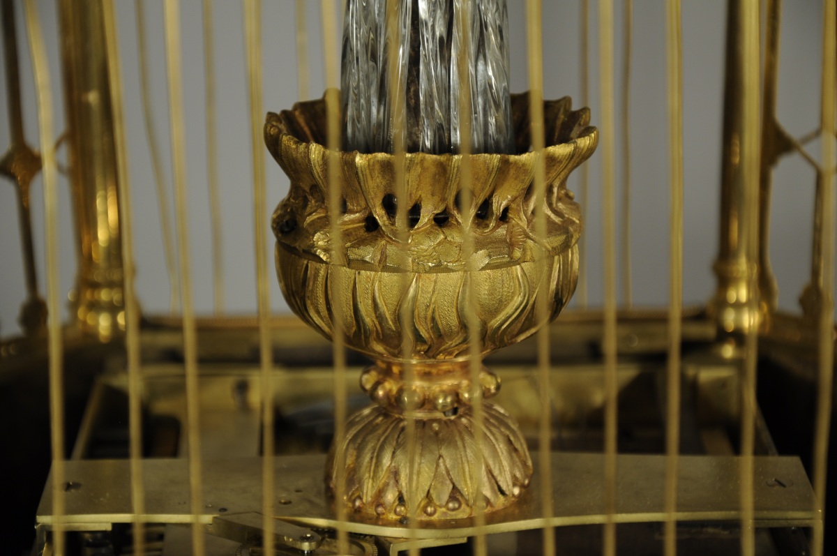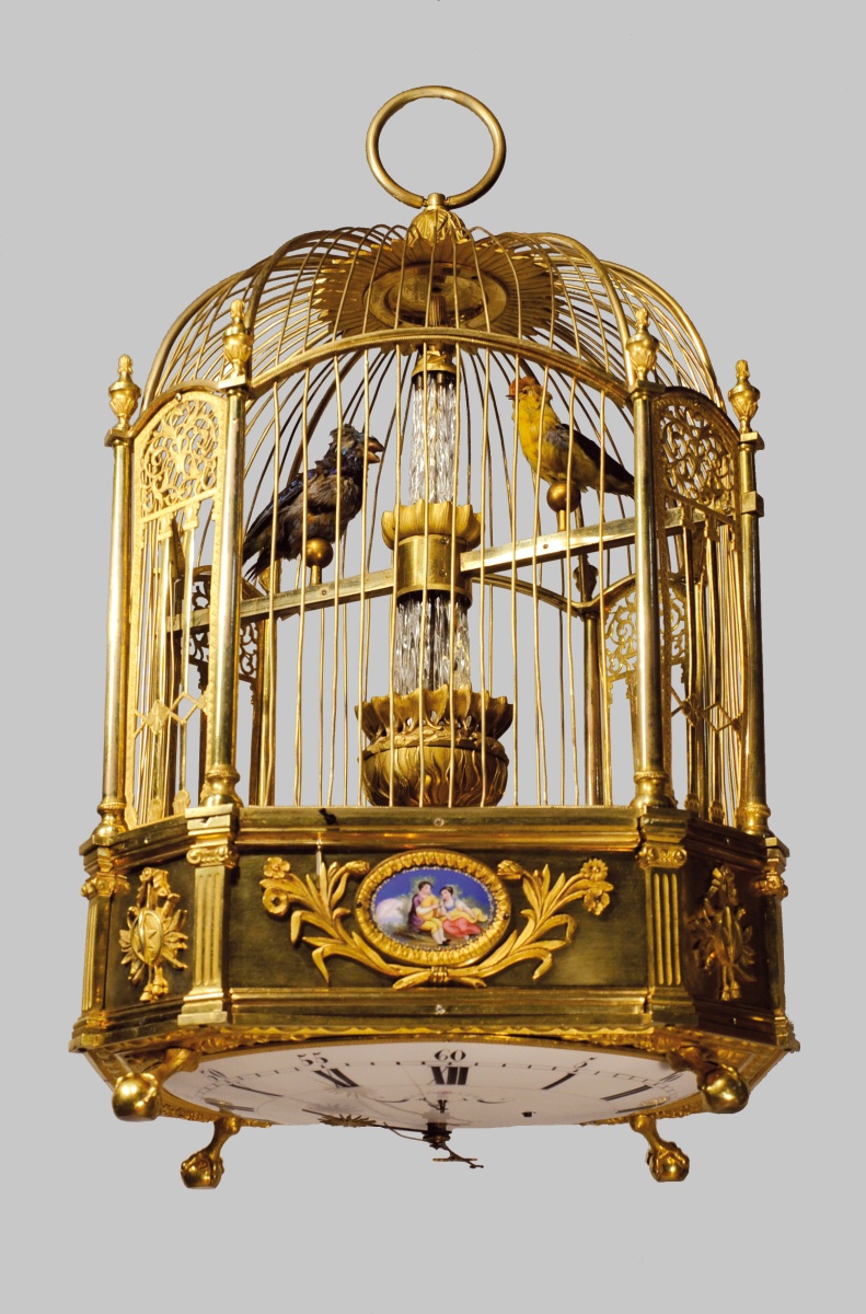 Le mécanisme de l'horloge, renfermé dans la base de la cage, se déclenche chaque heure et à la demande : l'orgue se met en marche laissant s'échapper le chant des oiseaux. La pendule joue cinq morceaux différents. Les oiseaux ouvrent leur bec et agitent leurs ailes tout en tournant sur eux-mêmes. Les jets d'eau de la fontaine sont simulés par la rotation de chaque tube de verre filé.