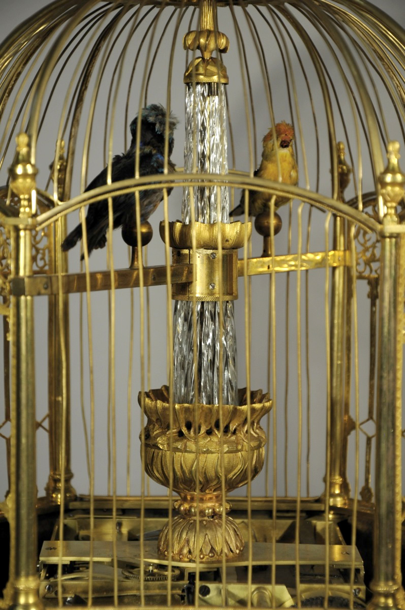 Au sein de la cage, deux oiseaux en automates reposent sur des perchoirs soutenus par une fontaine centrale, stylisée et à double étage, en verre de Venise soufflé torsadé. La base à frise d'entrelacs, ornée de quatre plaques émaillées à décor de joueurs de musique, renferme une serinette orgue.