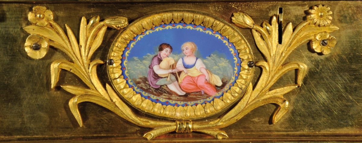 Anne Claude Louise d'Arpajon (1729-1794) est l'épouse du comte Philippe de Noailles, duc de Mouchy, prince de Poix, Grand d'Espagne et Maréchal de France (1714-1794). La comtesse Anne de Noailles est nommé dame d'honneur de la Dauphine Marie-Antoinette en 1770, puis première dame d'honneur de la Reine en 1774. La jeune reine surnomme " Madame Étiquette " celle qu'elle voit comme une " gouvernante " trop rigide. La comtesse de Noailles quitte Versailles pour Mouchy en 1775, après que la Princesse de Lamballe eut été nommée surintendante de la maison de la Reine. Marie-Antoinette fut l'une des plus célèbres clientes des Jaquet-Droz, dont la présentation d'un automate dessinant le couple royal à Versailles en 1775 avait frappé les esprits. La provenance de la pendule a été précisée par Yvonne de Brémond d'Ars, auprès de qui cet objet fut acquis par une importante famille de Touraine, en 1967.