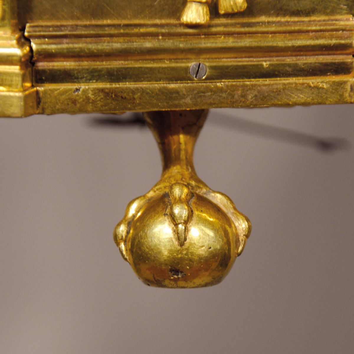 La cage repose sur quatre pieds représentant des pattes d'oiseau agrippées à des boules.