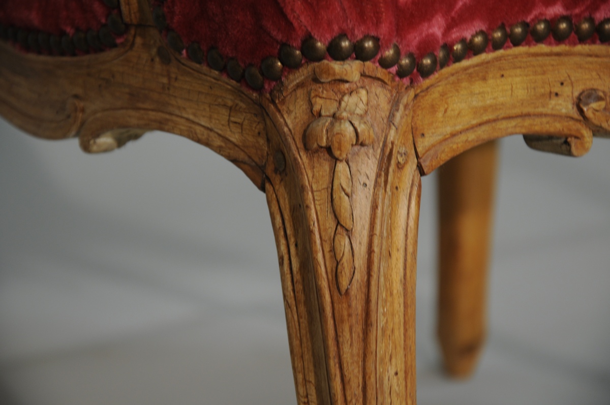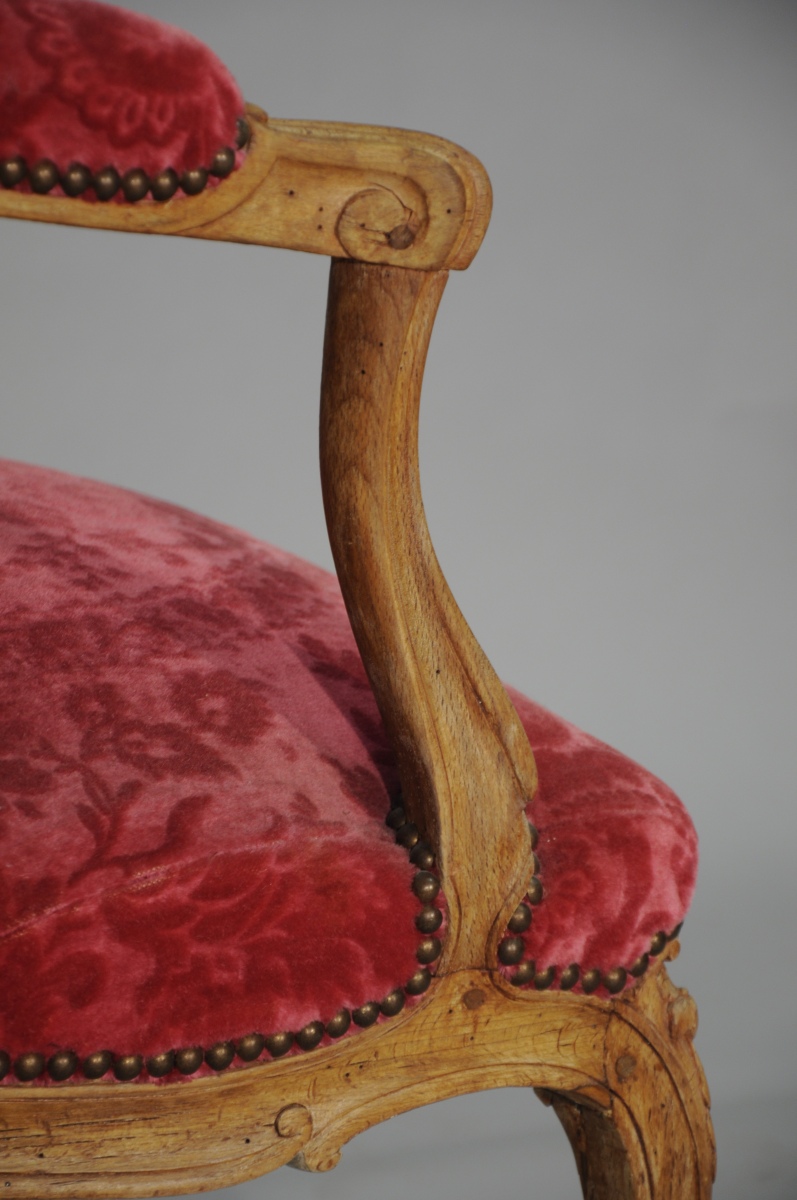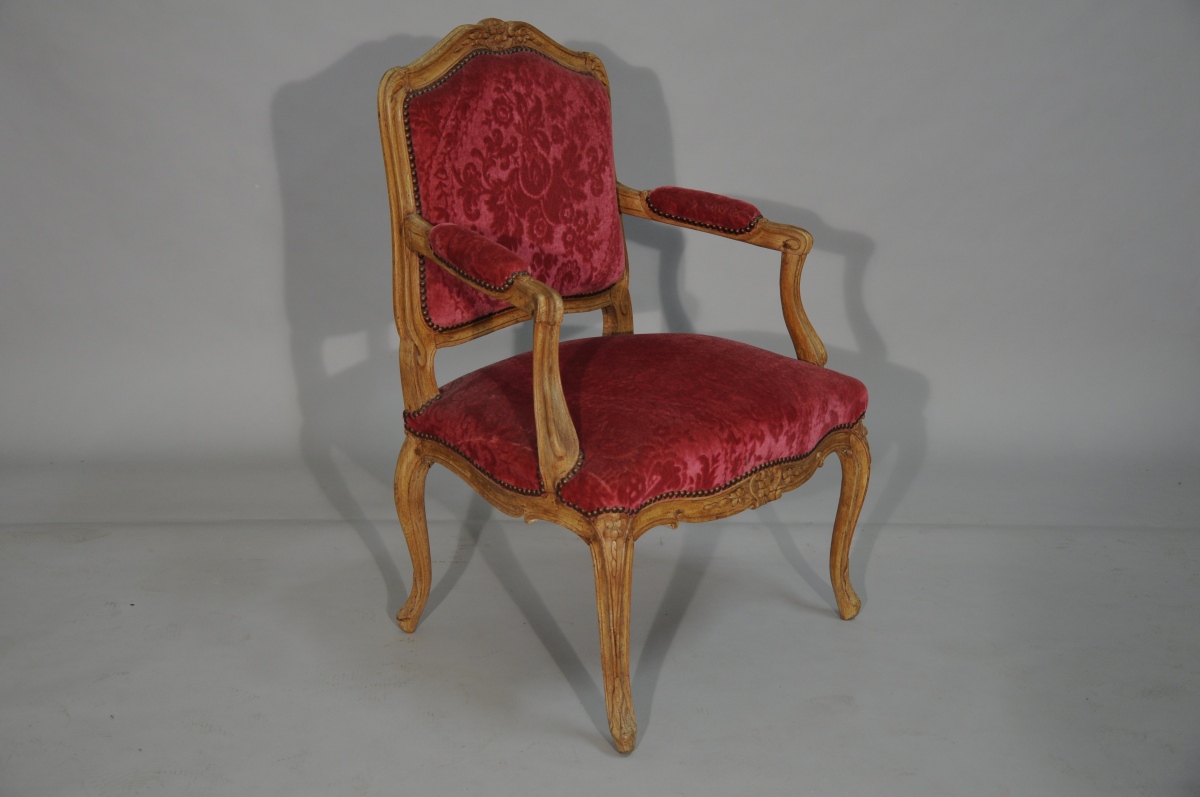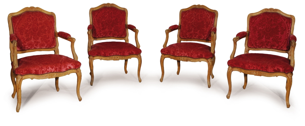 SUITE de quatre FAUTEUILS à la REINE en hêtre mouluré et sculpté. Dossiers à traverse supérieure en chapeau de gendarme. Accotoirs à consoles légèrement cambrées. Ceinture chantournée et pieds cambrés. Décor sculpté de fleurettes, agrafes et palmes.