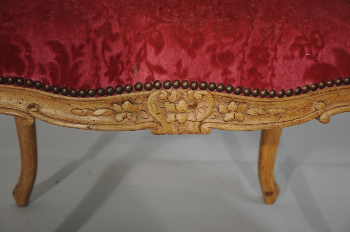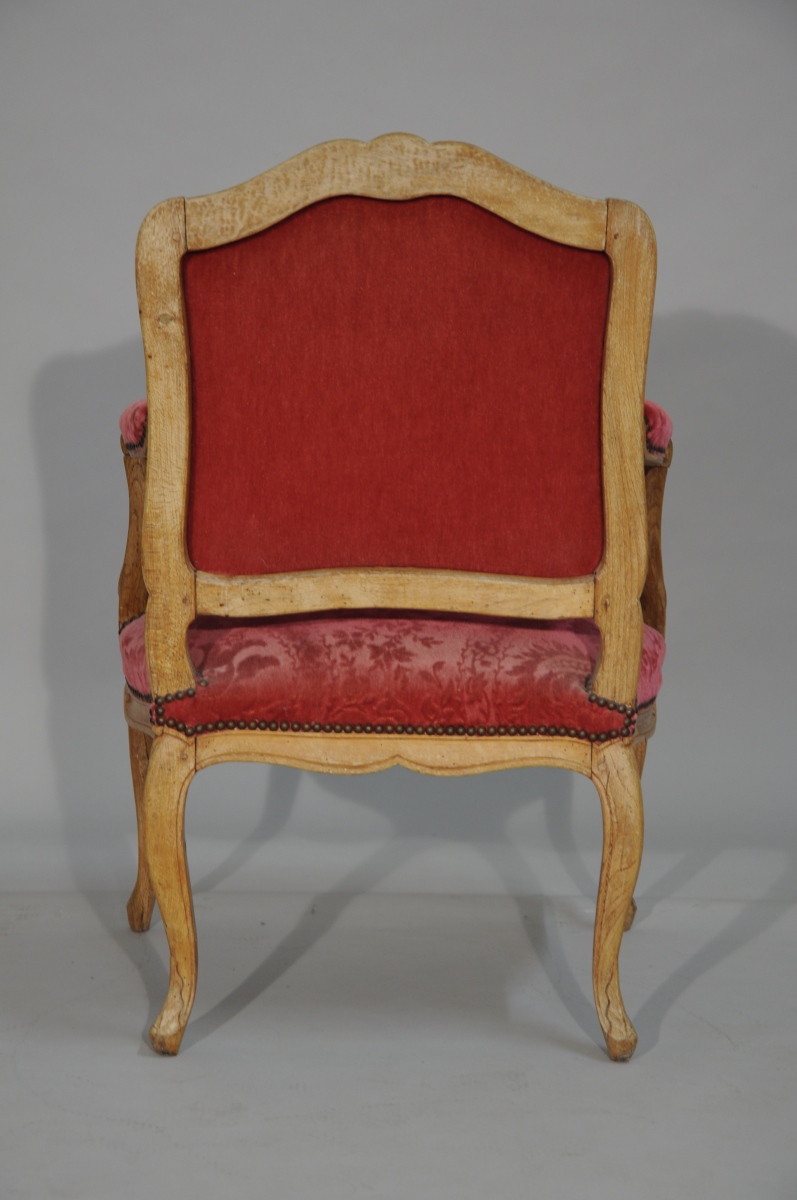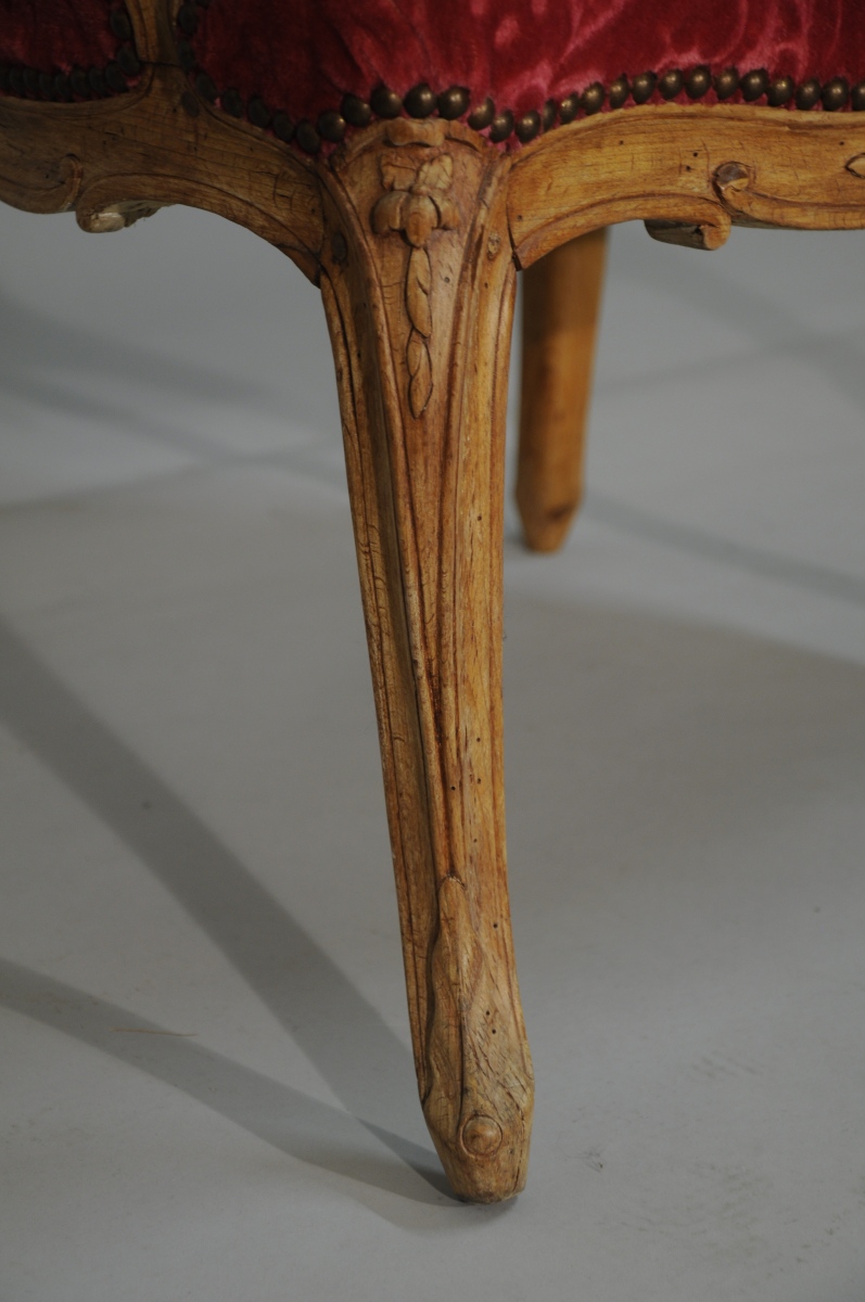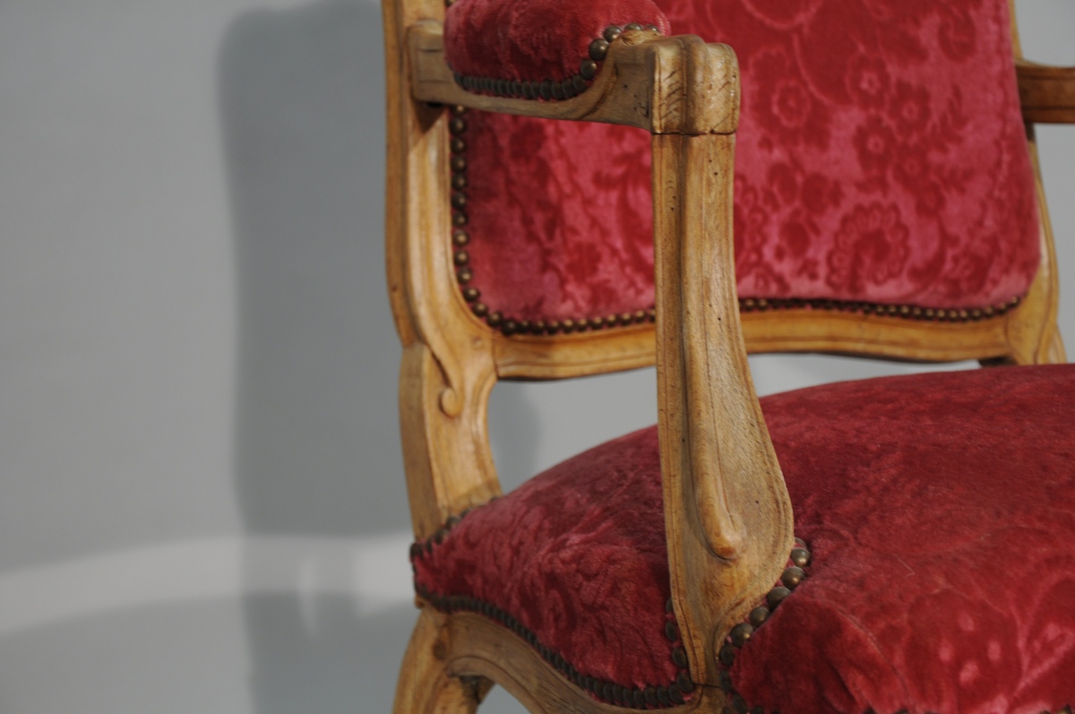SUITE de quatre FAUTEUILS à la REINE en hêtre mouluré et sculpté. Dossiers à traverse supérieure en chapeau de gendarme. Accotoirs à consoles légèrement cambrées. Ceinture chantournée et pieds cambrés. Décor sculpté de fleurettes, agrafes et palmes.