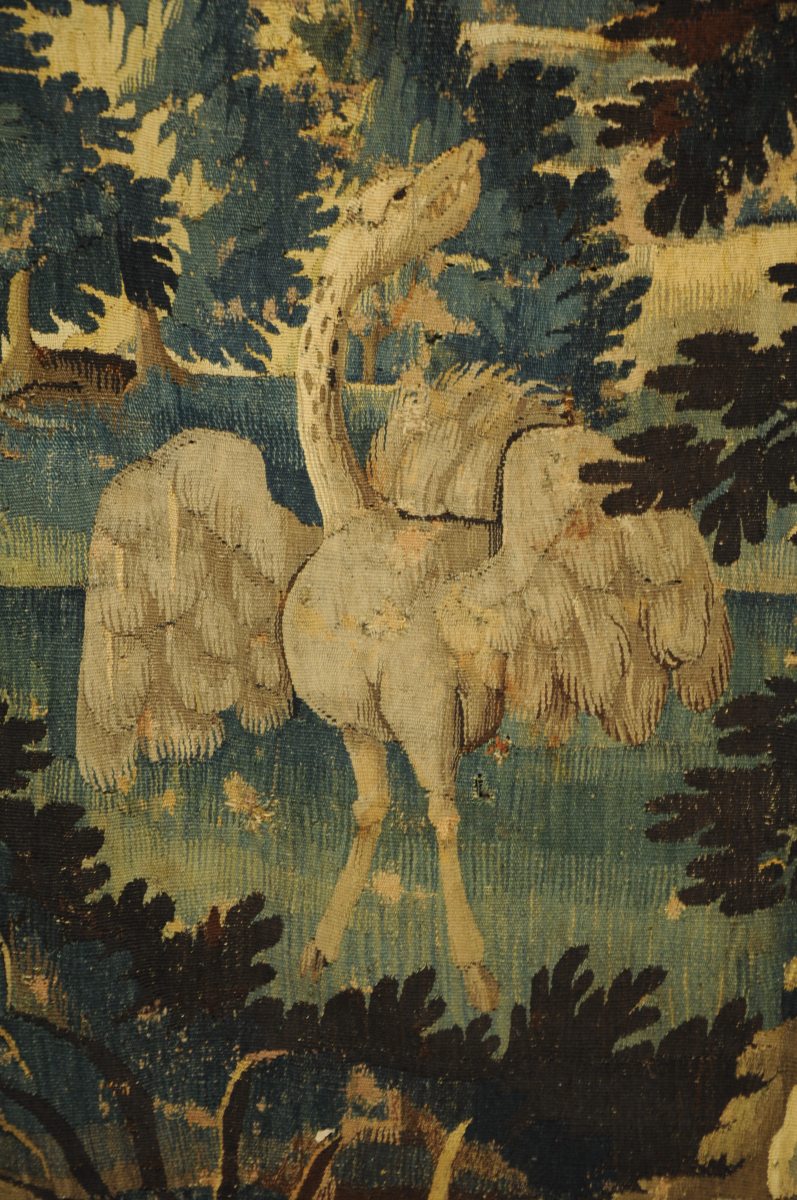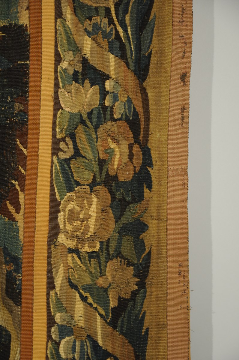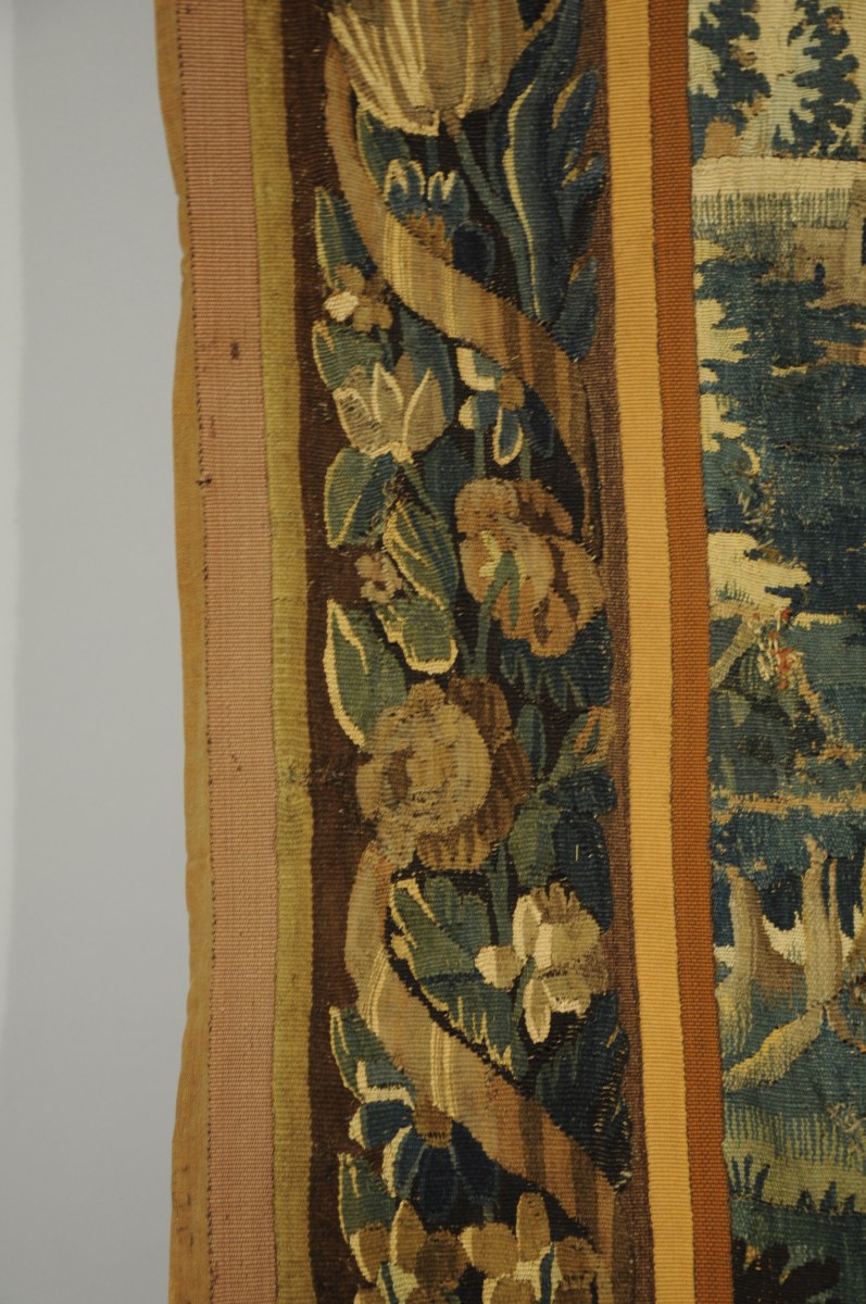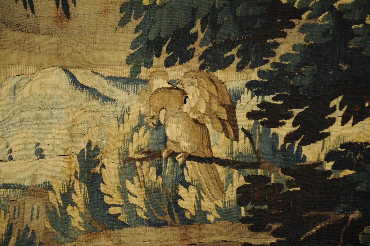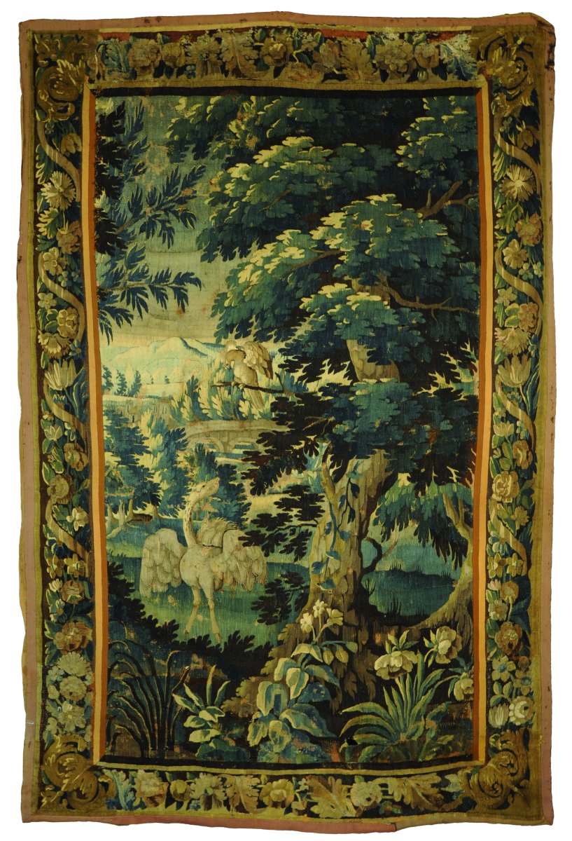 Verdure à décor de volatiles dans un paysage de forêt avec, dans le fond, un pont et des bâtisses. Bordure à guirlandes de fleurs et rubans.