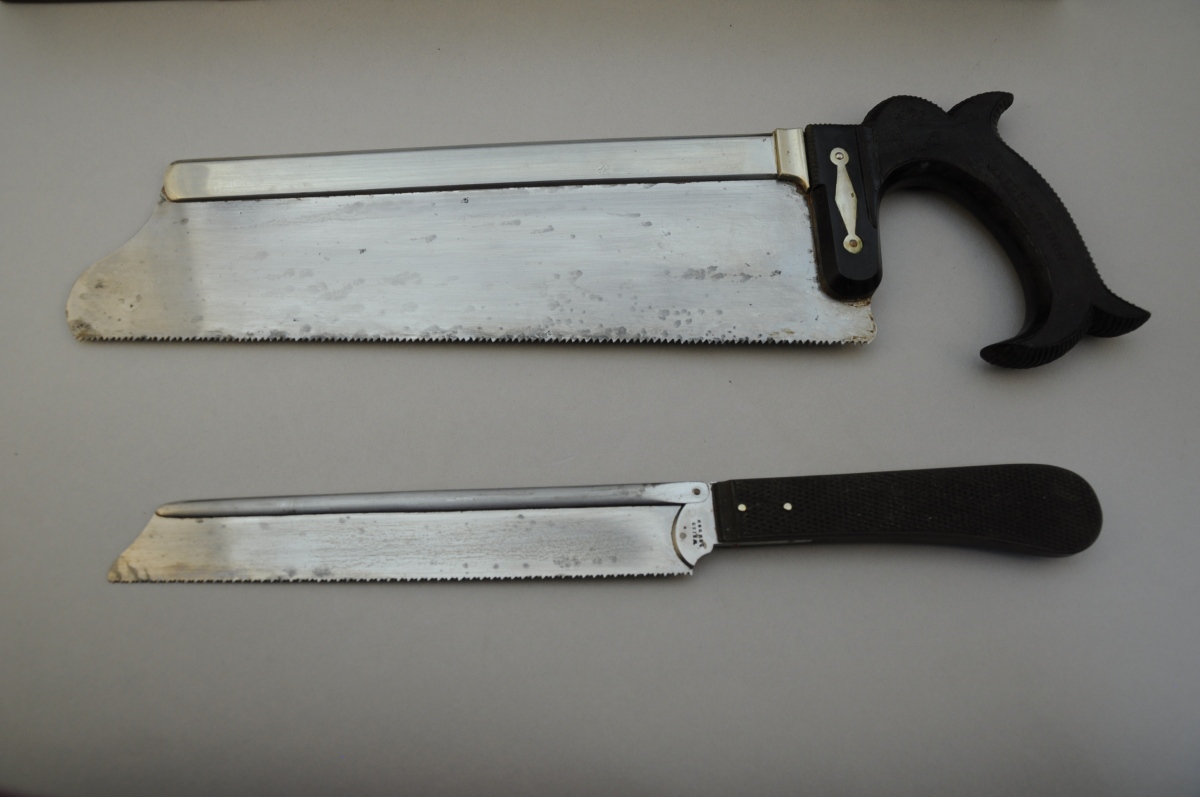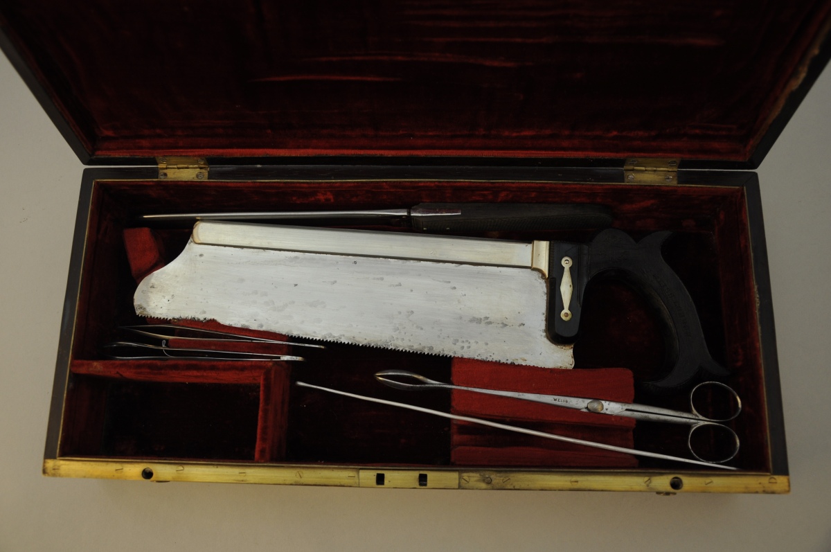JOHN WEISS, LONDON. NÉCESSAIRE de CHIRURGIE de CAMPAGNE. Le coffret, en placage d'acajou et armature de laiton, ouvre par deux boutons-poussoirs. L'intérieur, garni de velours rouge, comprend deux niveaux, garnis de couteaux à lames lisses ou crantées, de pinces et d'une scie. Manches et lames marqués "Weiss London".
