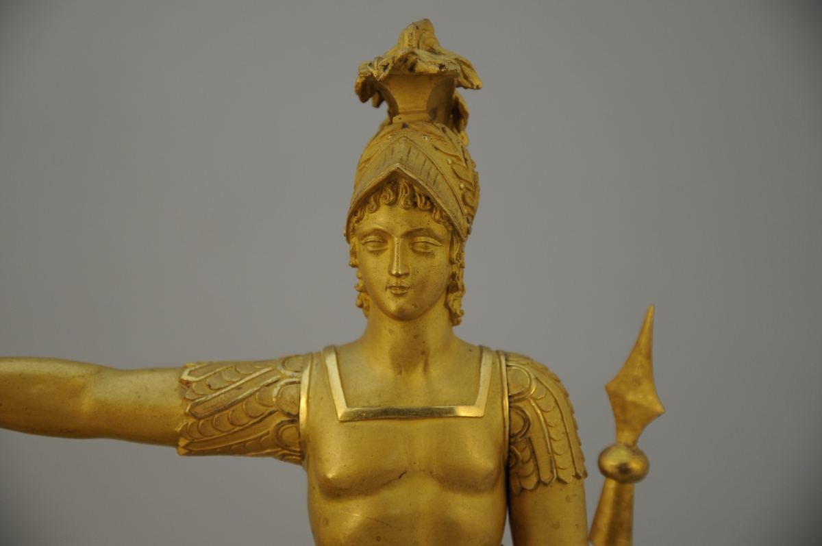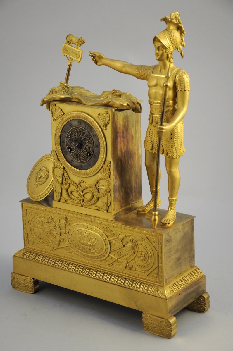 sur quatre pieds à décor de fleurons et guirlandes de fleurs. Le corps est orné de trophées guerriers et d'un médaillon central à "foudres". La borne à décor de carquois, de guirlandes, d'un serpent et de casques. À droite, Télémaque, en armure, tient une pique et désigne l'emblème portant son nom. Sur la borne, une peau de lion. À gauche, une massue et un bouclier.