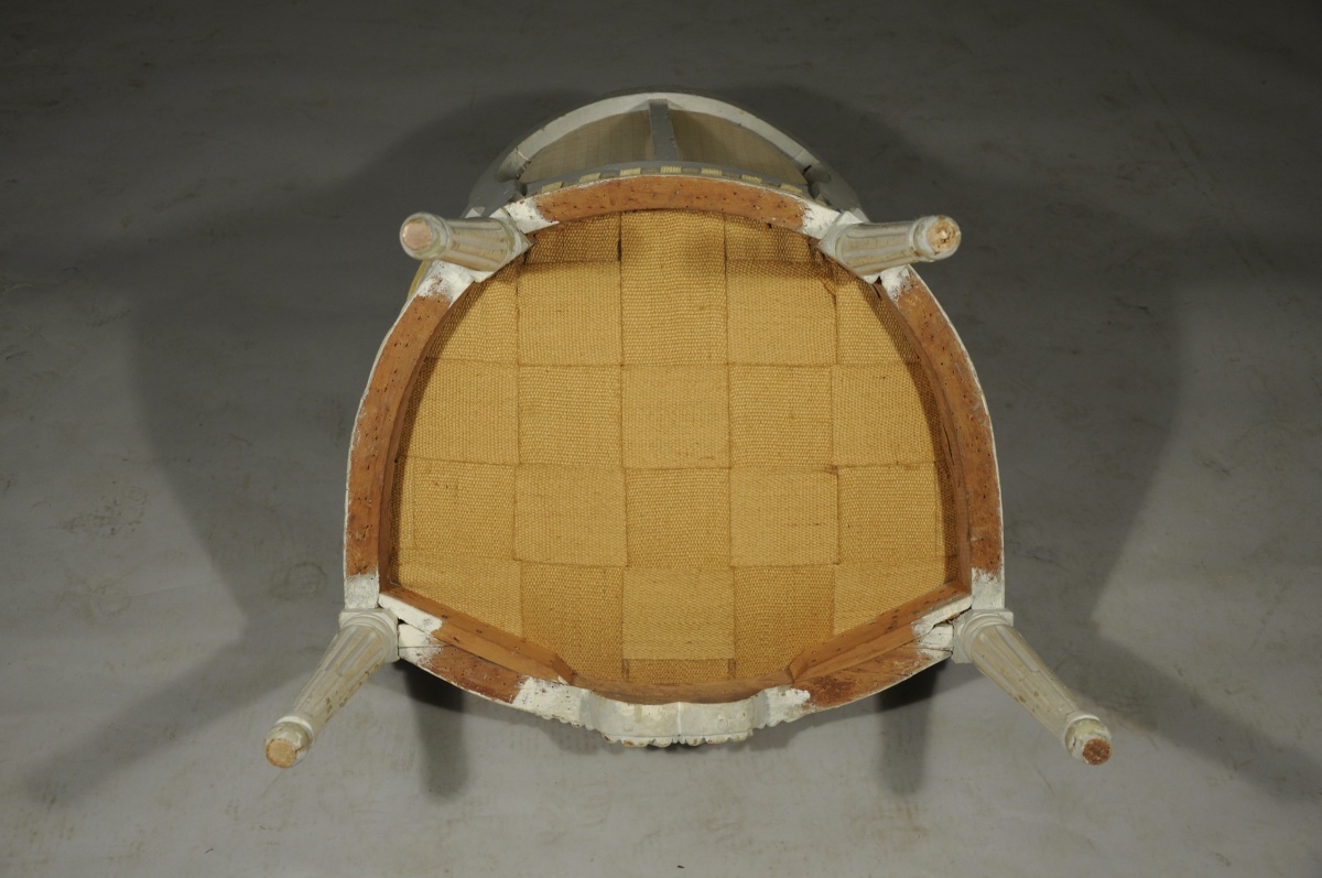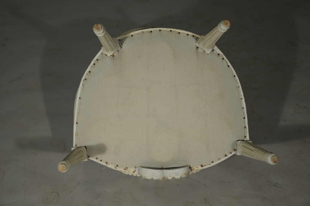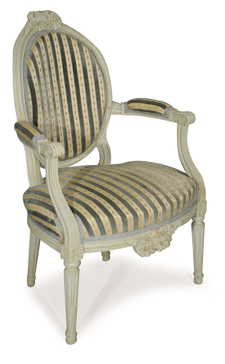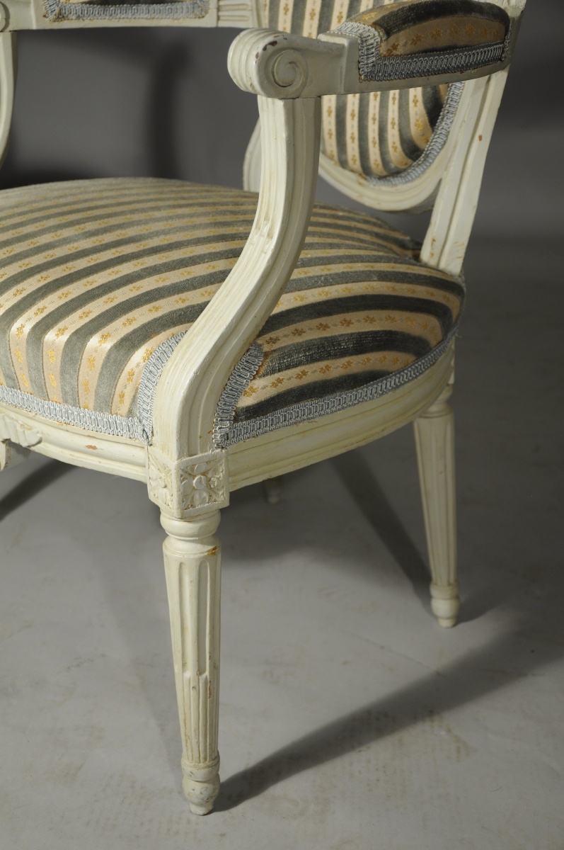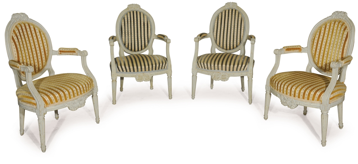 Suite de quatre FAUTEUILS cabriolets en bois mouluré et sculpté, et relaqué crème. Dossier médaillon. Accotoirs se terminant en volutes, et reposant sur des consoles galbées. Dés de raccordement sculptés de fleurettes. Pieds fuselés, cannelés et rudentés à l'avant. Dossier et traverse antérieure sculptés de nuds de rubans.