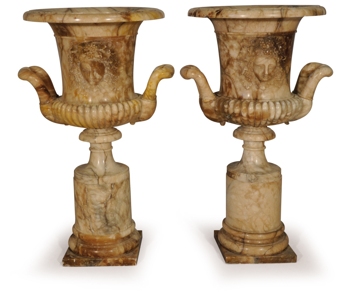 Paire de VASES MÉDICIS en albâtre. Partie inférieure de la panse godronnée. Au centre, visage sculpté de Bacchus, avec des pampres de vigne dans la chevelure. Anses de part et d'autre. Les vases reposent sur un fût en forme de colonne.