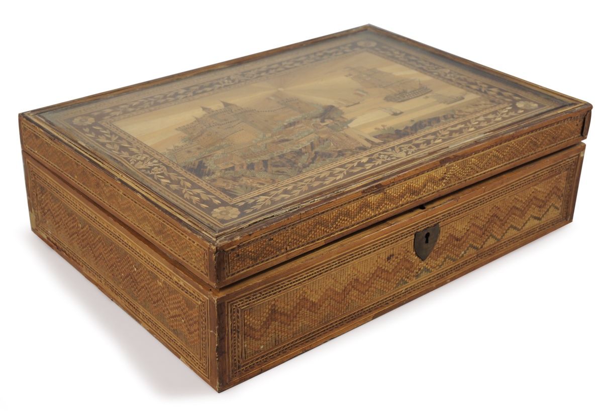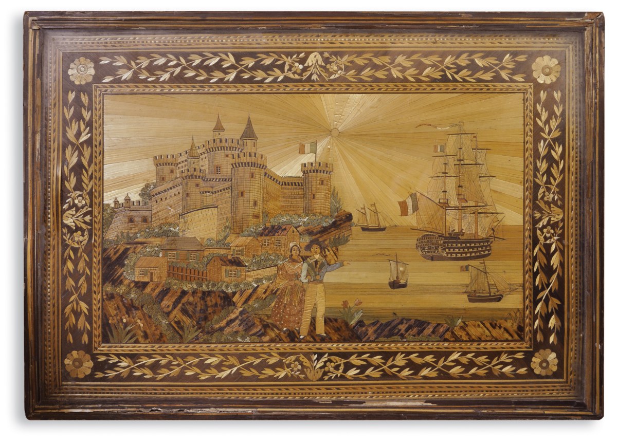 Le couvercle, foncé à l'intérieur d'un miroir, découvre un intérieur séparé, en partie inférieure, en deux compartiments, et comportant, en partie supérieure, un casier amovible. Ce dernier comporte deux coussins de brodeuse et quatre compartiments. Sur le couvercle,protégé par une vitre, scène de port agrémentée d'un château et de bateaux sur lesquels flotte le drapeau tricolore, et animée d'un jeune couple se tenant par le bras. L'ensemble est encadré de tiges entrelacées et de fleurs.À l'intérieur, décor d'un trophée de musique, de vases fleuris et des attributs de l'amour : carquois de flèches, flambeau et deux curs transpercés par la même flèche. Côtés marquetés de chevrons. Entrée de serrure en forme d'écusson.