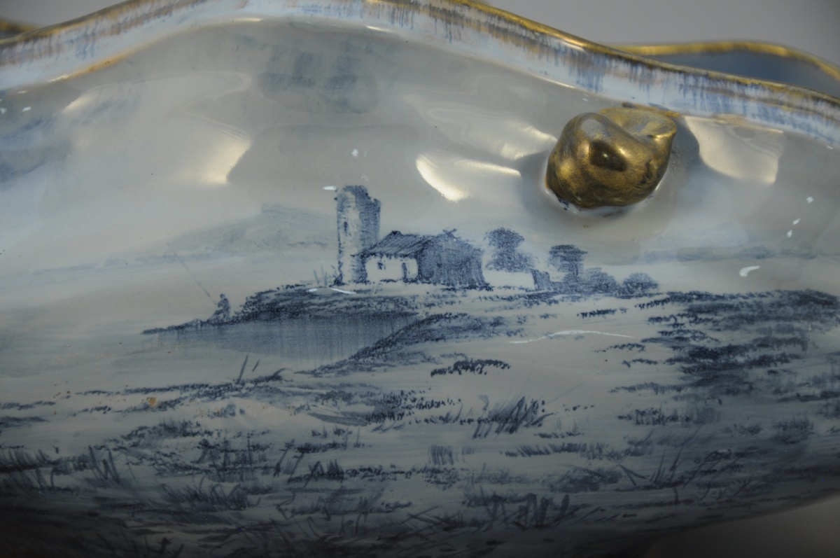 Émile GALLÉ (Nancy, 1846 - Nancy, 1904). Large COUPE en forme de conque en faïence stannifère à fond bleuté. Décor en camaïeu bleu de bateaux et de paysages animés en bord de mer. Six coquillages dorés sont accrochés au bord de la conque. Signée au revers "E. Gallé Nancy".
