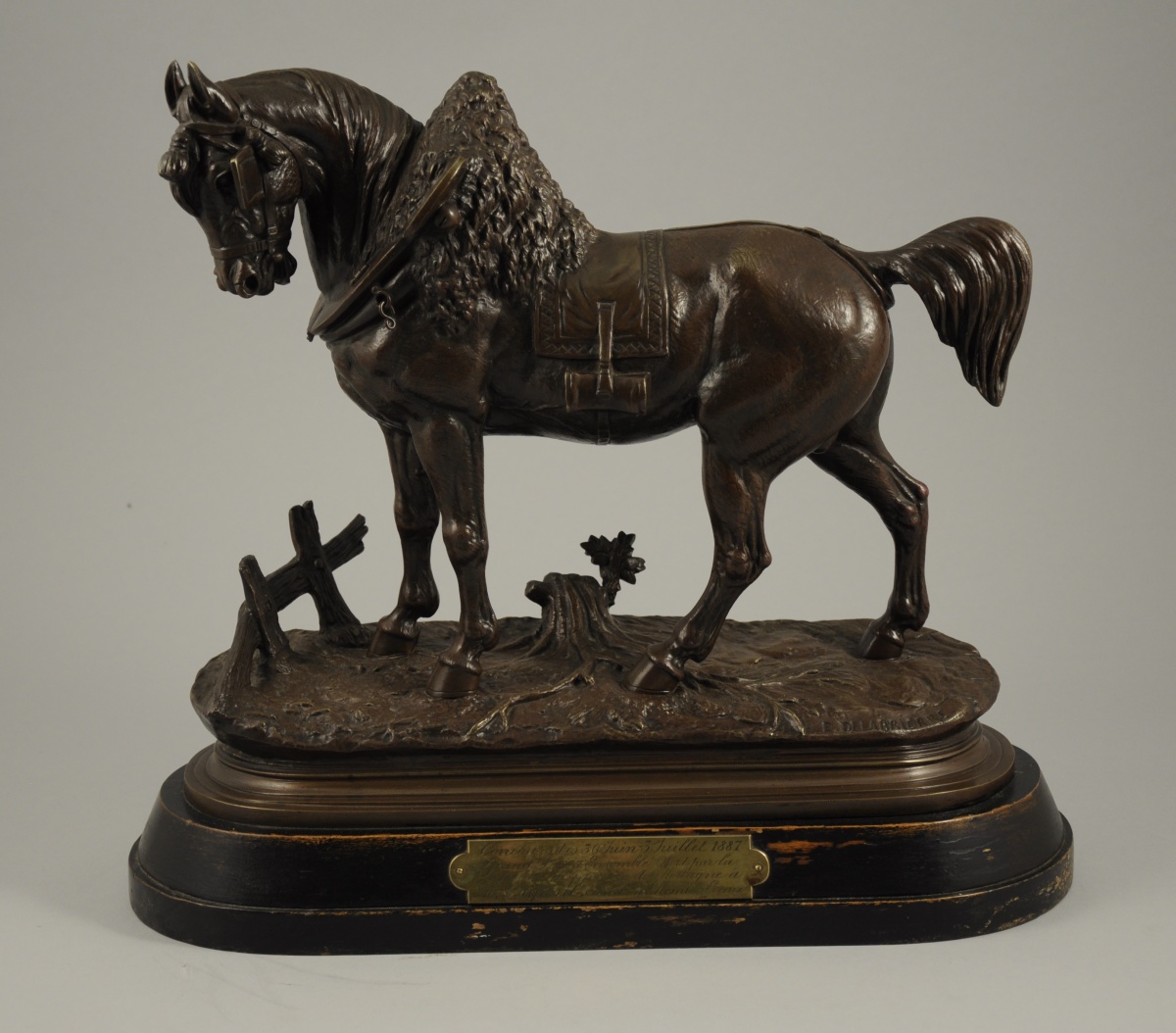 Cartel en laiton sur le socle : "Concours des 30 Juin-3 Juillet 1887 / Grand Prix d'Ensemble Offert par la / Société Hippique de Mortagne à / M. Dupont, Eleveur à Mesnil-Erreux."