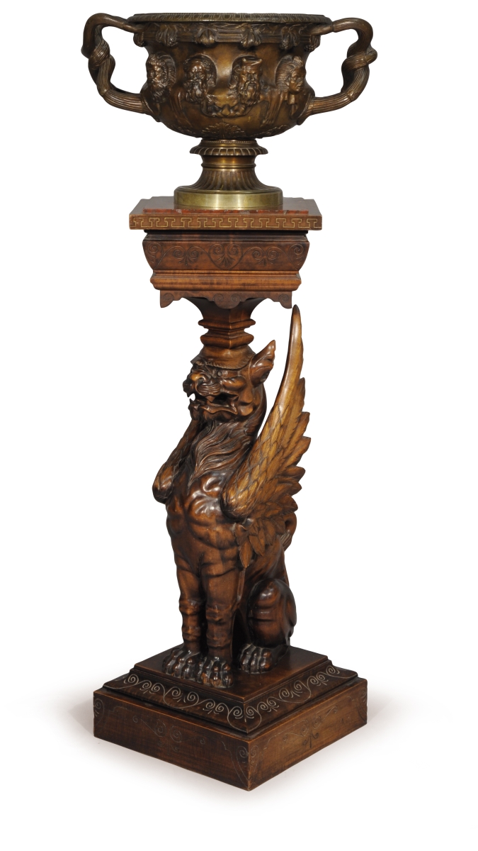 CRATÈRE en CALICE en bronze à patine brune, reposant sur une console en noyer sculpté.