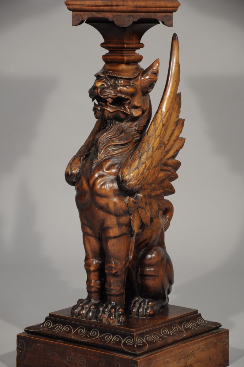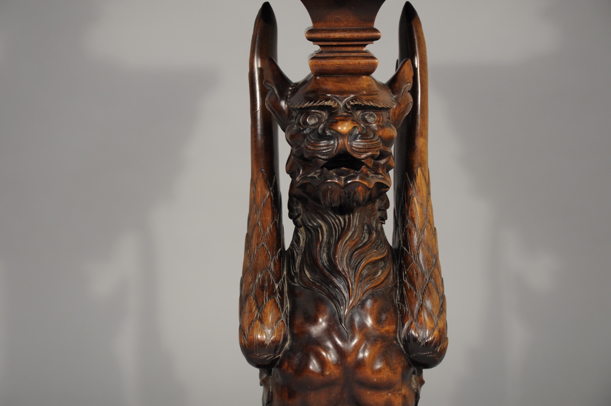 La console figure une chimère ailée, assise. Base et corniche quadrangulaires, ornées de palmes et volutes gravées. Dessus de marbre griotte.