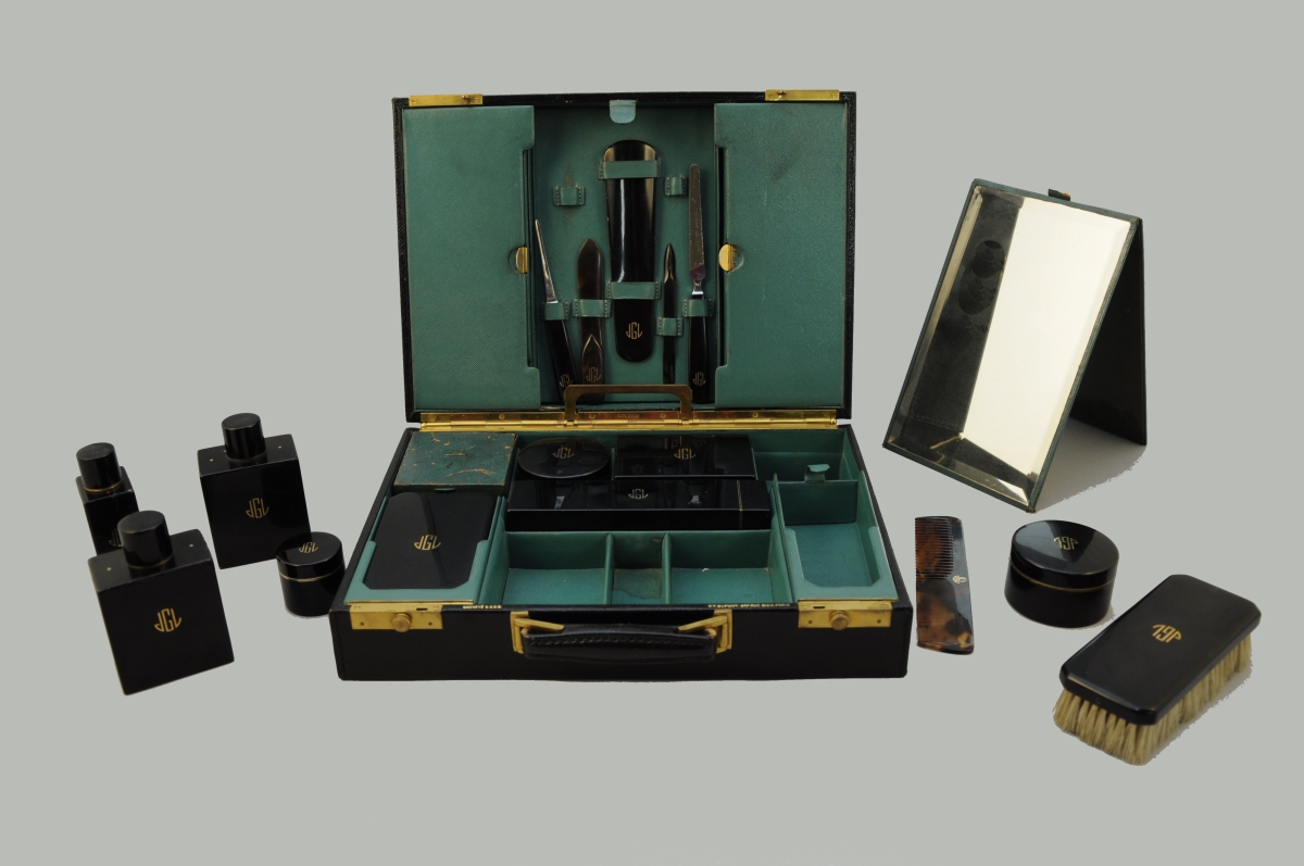 DUPONT. Mallette de voyage en cuir noir. Poignée rétractable. Fermetures en laiton. Intérieur en cuir vert compartimenté, comprenant un nécessaire de toilette laqué noir, avec flacons, boîtes, brosses, instruments de manucure, peigne et miroir. Les différents éléments sont monogrammés JGL. Signée à droite, près du fermoir.
