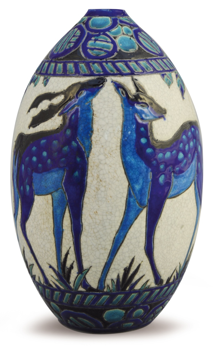 VASE ovoïde en céramique émaillée, dite faïencée, à décor de cervidés bleus sur fond craquelé blanc. Motifs végétaux stylisés en partie inférieure et supérieure. Signature et tampon de la manufacture sous la base (modèle D 943).