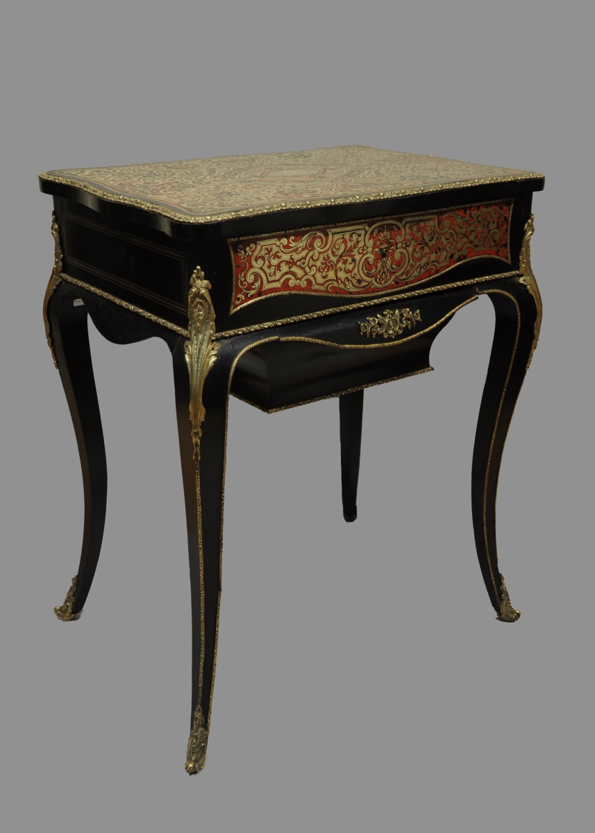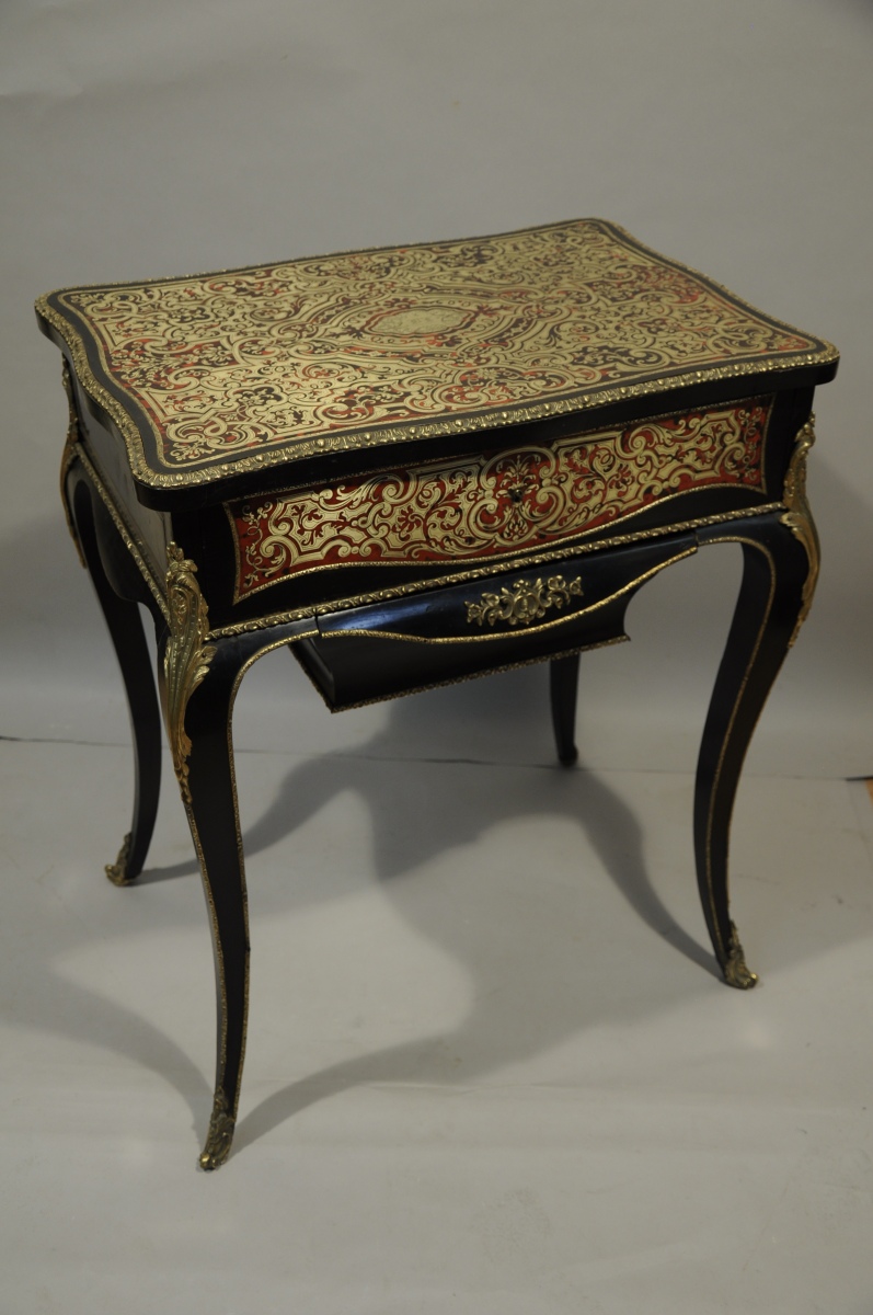 TABLE TRAVAILLEUSE en marqueterie dite "de Boulle". Placage d'écaille rouge en première partie et filets de laiton ; placage d'ébène et de bois noirci. Sur le plateau, monogramme "B.L." Elle ouvre par un abattant foncé d'un miroir, découvrant un intérieur avec casier en placage de palissandre, et par un tiroir en partie inférieure. Pieds cambrés. Garnitures de bronzes ciselés et dorés, telles que lingotières, chutes d'angles, sabots de pieds.