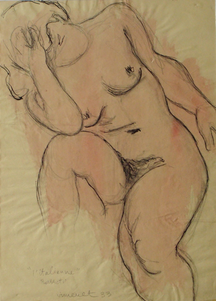 Fusain, gouache et encre signé, titré et daté en bas à gauche au crayon : " Vimenet l'Italienne Bassetti 33 ".