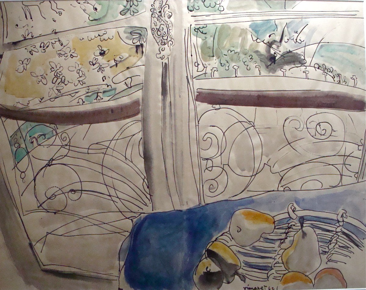 " Fenêtre au compotier ".Dessin aux encres de couleur signée...