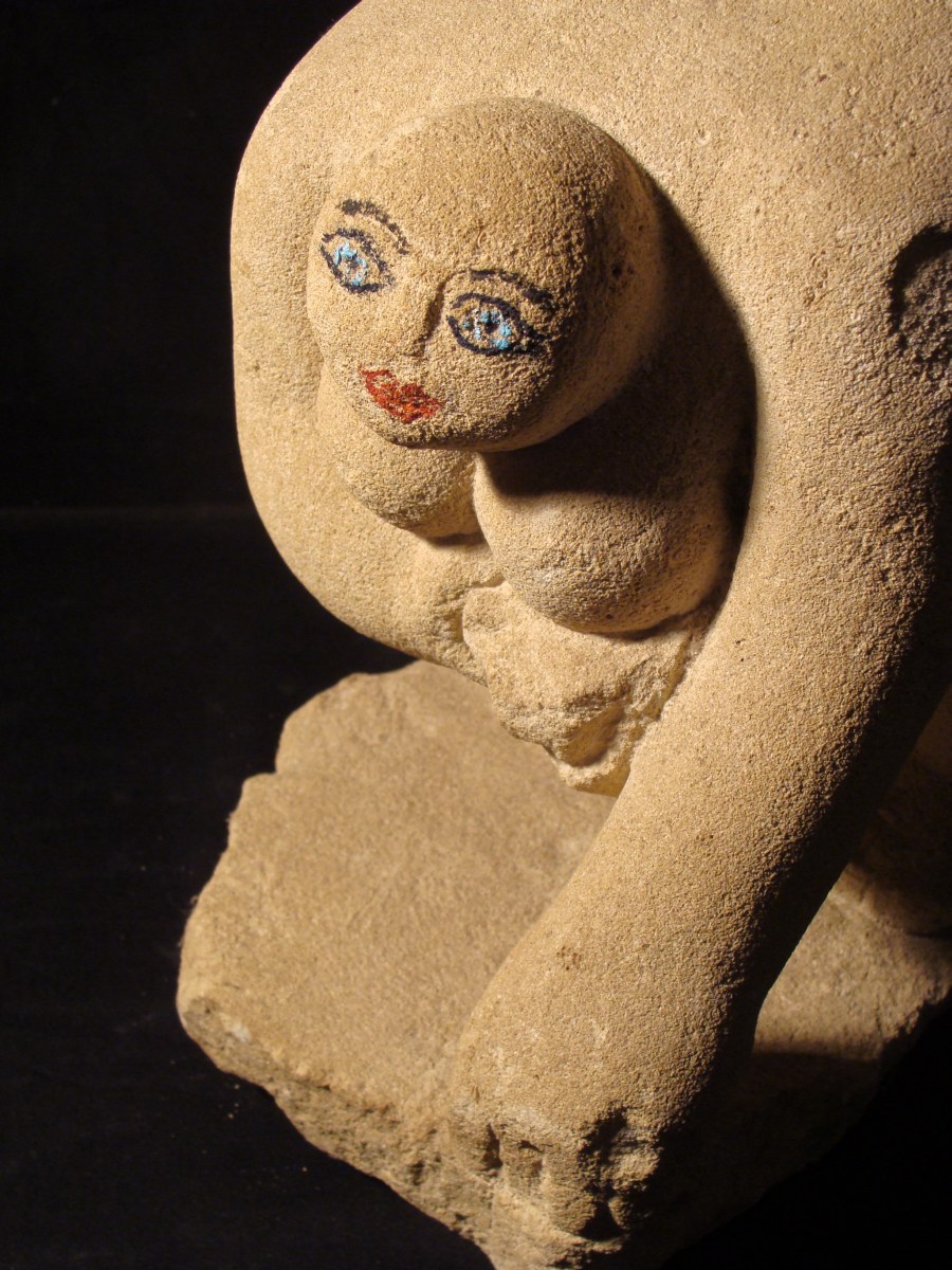 Taille directe sur pierre calcaire ocrée, polychrome.