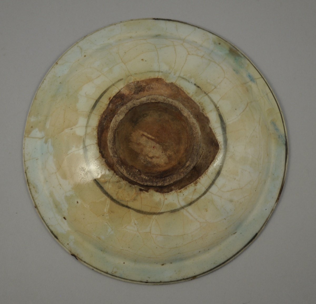 COUPELLE en céramique siliceuse à décor peint en noir et vert sur fond crème sous glaçure incolore. Décor d'arcatures autour d'un médaillon garni de cinq lobes.