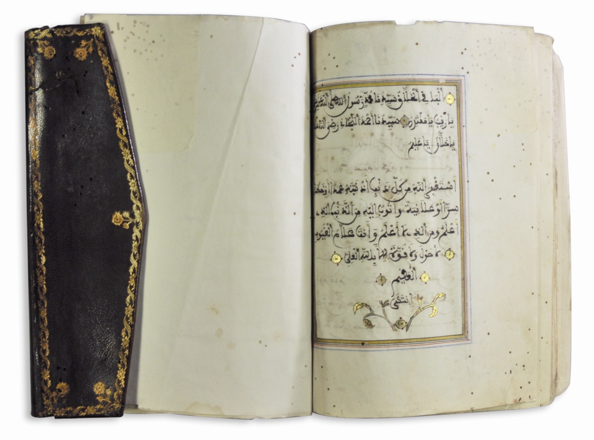 Manuscrit sur papier de 93 feuillets en écriture maghribi de 11 lignes par page. Frontispice en unwân à décor polychrome et or de rinceaux fleuris et demi-palmettes à redans. L'ouvrage se divise en deux parties, la première contenant plusieurs sourates, et la seconde, introduite par un unwân reprenant la disposition du frontispice, présentant des invocations et des éléments biographiques sur al-Tijânî. Les titres des différents chapitres sont inscrits dans des unwân-s polychromes fleuris et écrits à l'encre bleue, et le texte à l'encre brune et rehauts violines est scandé de rosettes dorées. Reliure en cuir brun à rabat à décor estampé doré d'un bouquet de fleurs au centre et dans les angles, dans un cadre en ruban de palmettes et fleurs épanouies.